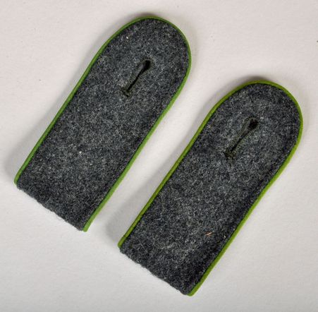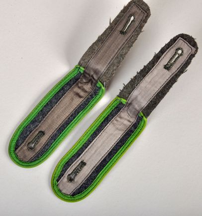 A nice late war set of apple green silk piped late grey centred shoulder boards for a Panzer Grenadier tunic. The reverse sides are only skeleton lined in grey silk normally encountered on most late war shoulder boards.
