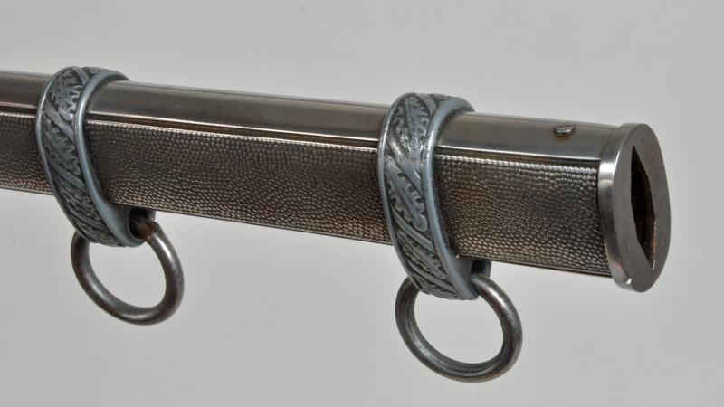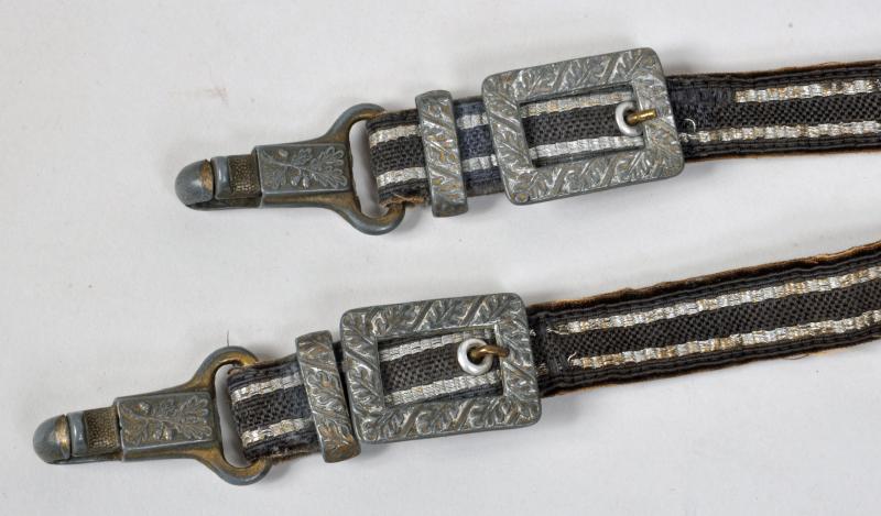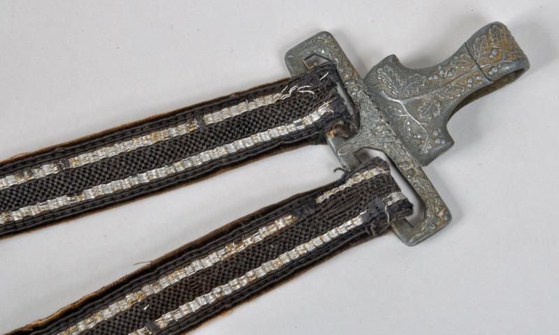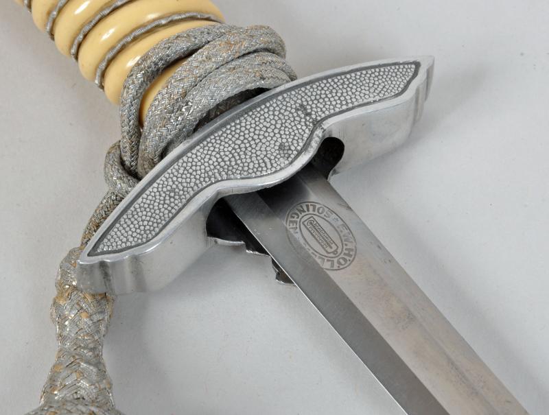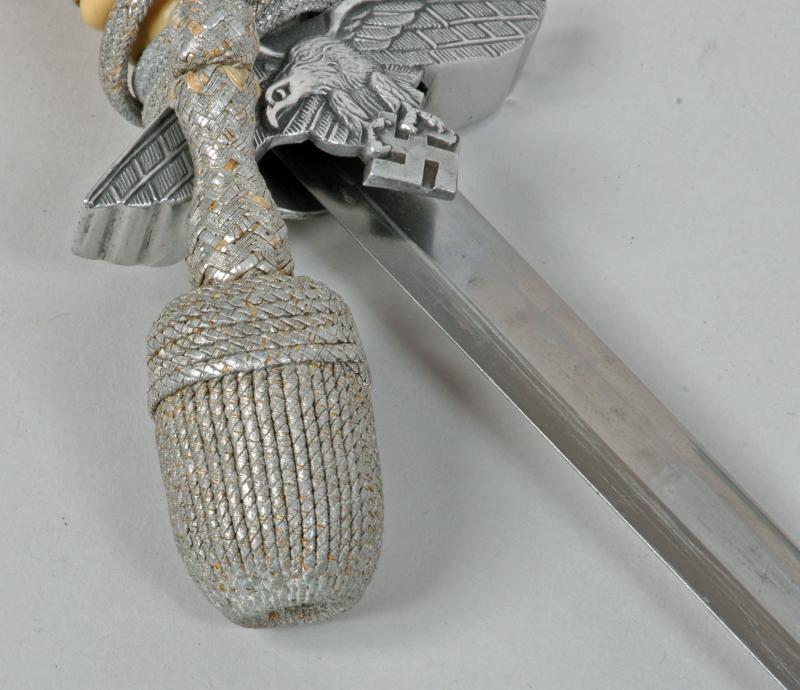 Excellent blade with cross grain finish remaining by F.W.Holler, Solingen, very minor chipping to the point area of the blade. All of the fittings match in colour, no dents to the scabbard, white grip with its original grip wire intact. Some slight chipping to the area between the top strand of wire and the upper pommel. With its original correct pattern short portapee knot and a set of the deluxe Luftwaffe officers dagger hangers with all spring mountings working correctly. Slight oxidisation to the brocade.