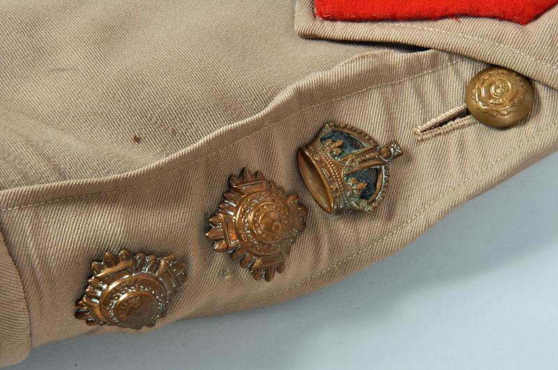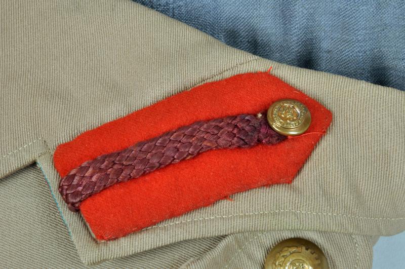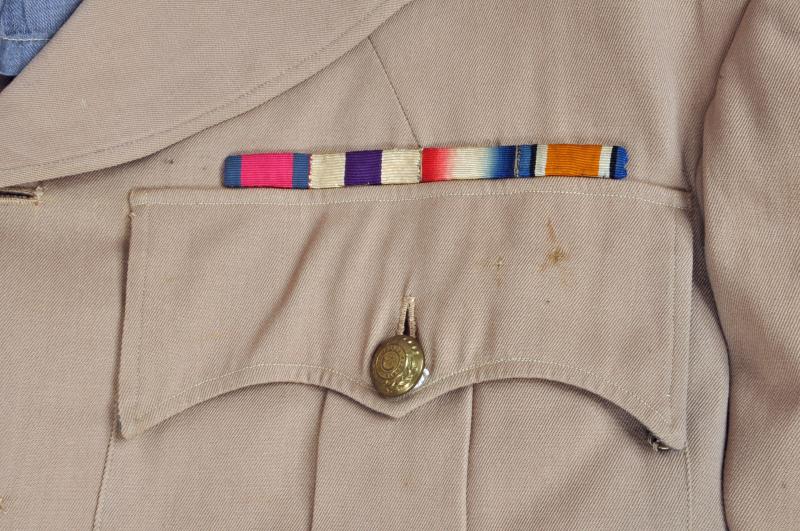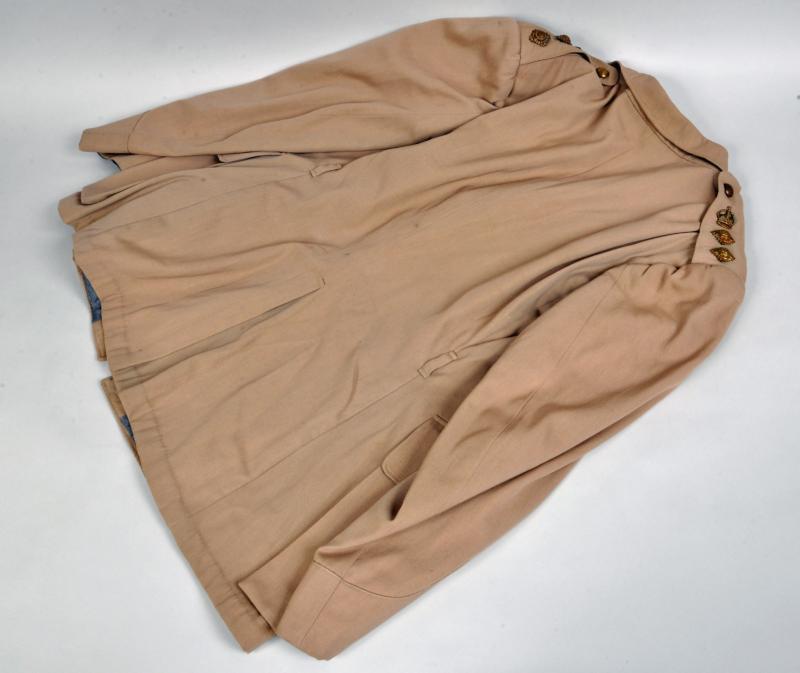 A very nice condition lightweight tunic, skeleton lined, with rank insignia of a full Colonel. Two rank pips and one crown. Medal ribbon bar of DSO, MC., WWI Victory Medal and WWI Service Medal. No moth damage or staining. There was original fitted a very thin waist belt, this is missing. Staff officers gorget patches fitted to each collar.