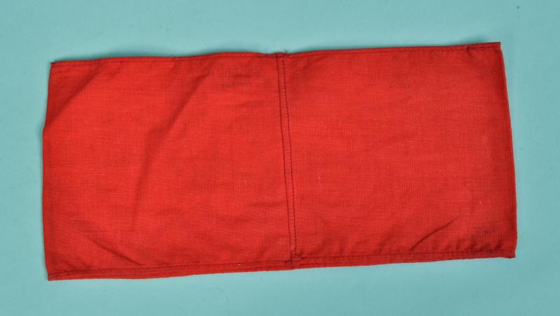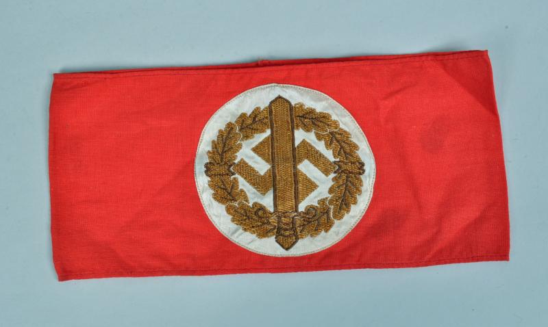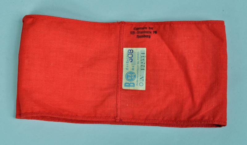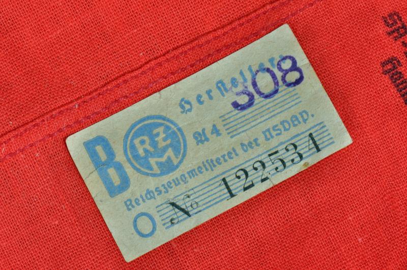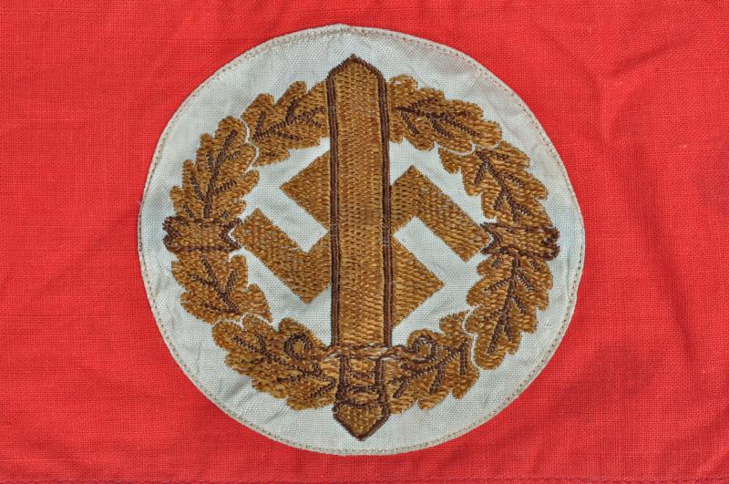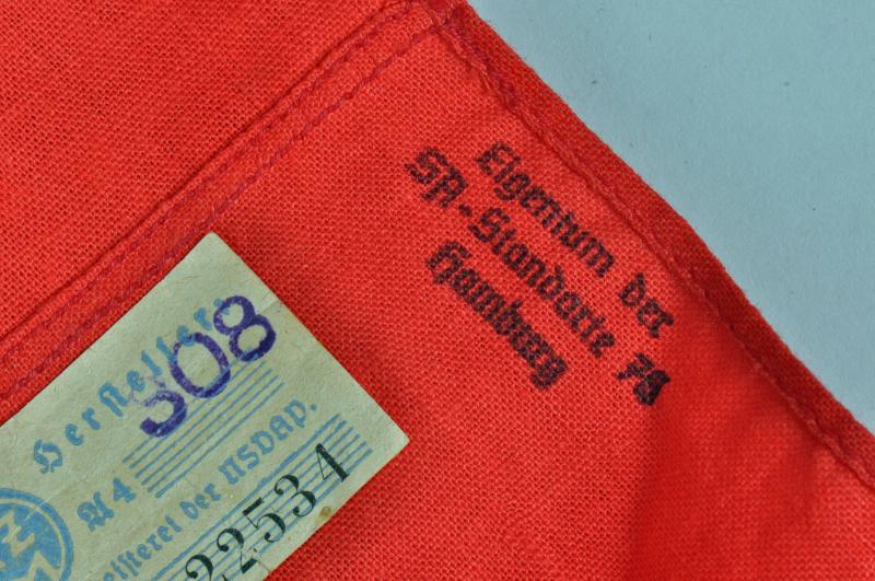 A lovely quality central SA logo machine woven in gold on a white field on red basic flag cloth, with its original paper RZM ticket to the interior and its unit marking for SA Standarte 76 Hamburg.