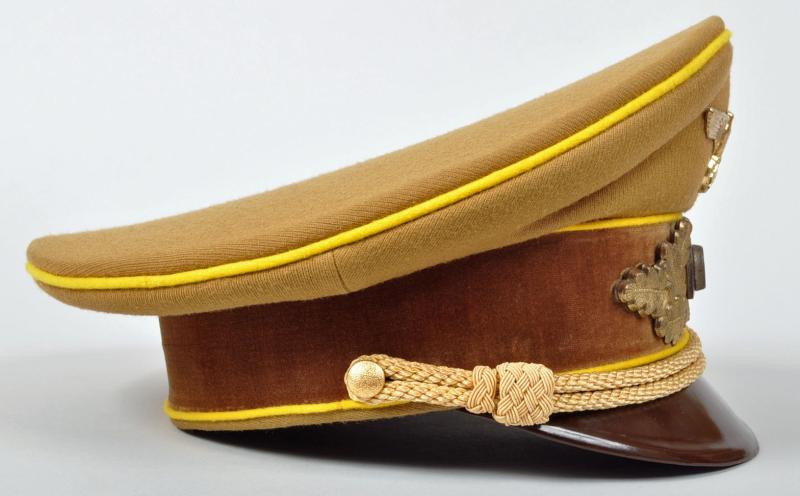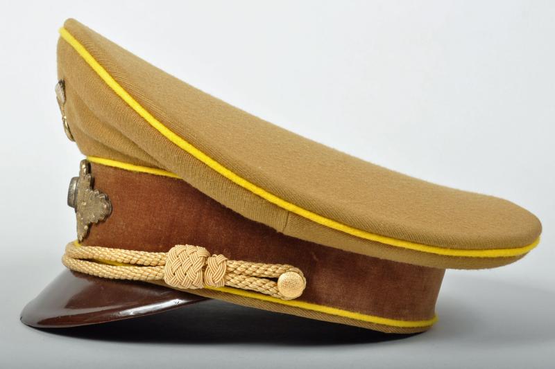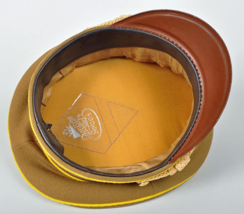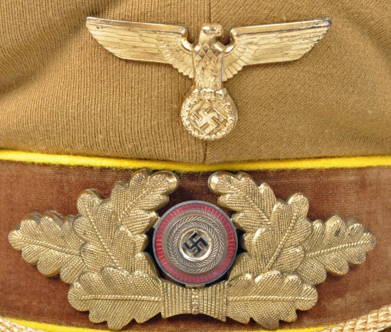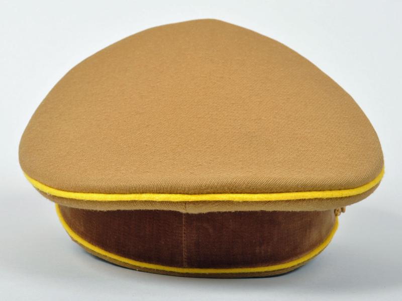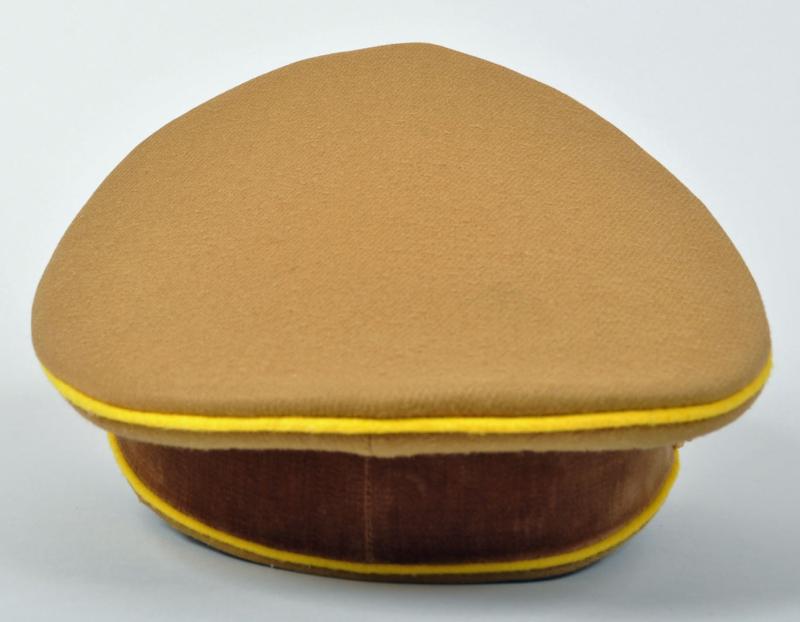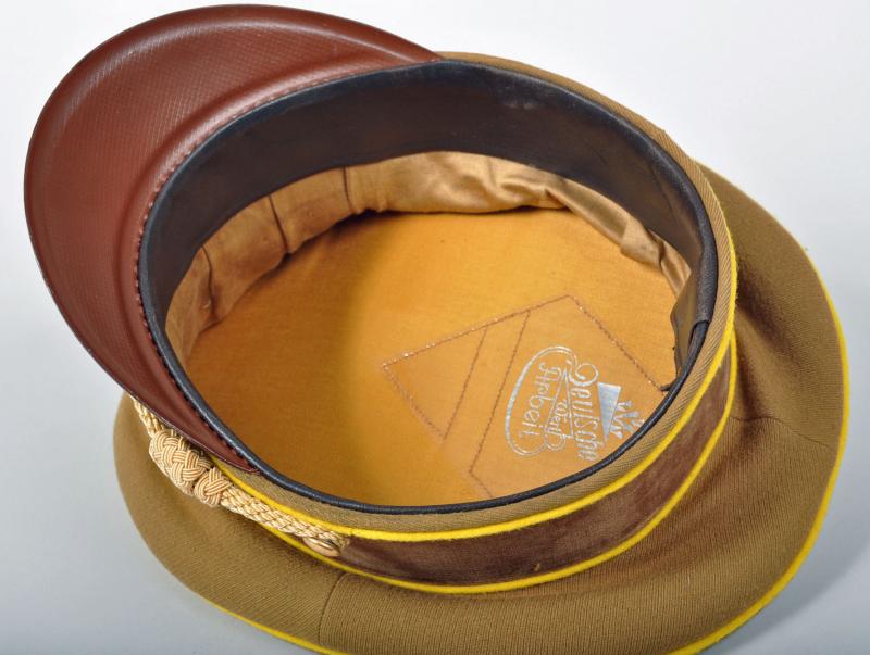 The officials of the NSDAP were identified by the colours of their individual groups, the lowest being blue. followed by white, followed by wine red and finally Reich Level Central Government in yellow. This is a very fine example of a Reichleiters visor cap in the heavy grained political material. Yellow piped to the crown and to the upper and lower sections of the velvet centre band. A lovely matched set of gilded insignia with the enamel undamaged to the central political cockade. The gold cord is of the cellion construction with twin political style side buttons. Standard brown front visor with its dark brown sweatband in a condition that indicates the cap has probably hardly ever been worn. On pulling back the sweatband the RZM paper ticket can clearly be seen, stitched with three stitches into the inner material lining. The upper inner crown lined in a very lightweight rust brown material with a small central celluloid lozenge with below in silver block ‘DEUTSCHE WERT ARBEIT’. A magnificent high saddle shaped cap for a Reichleiter.