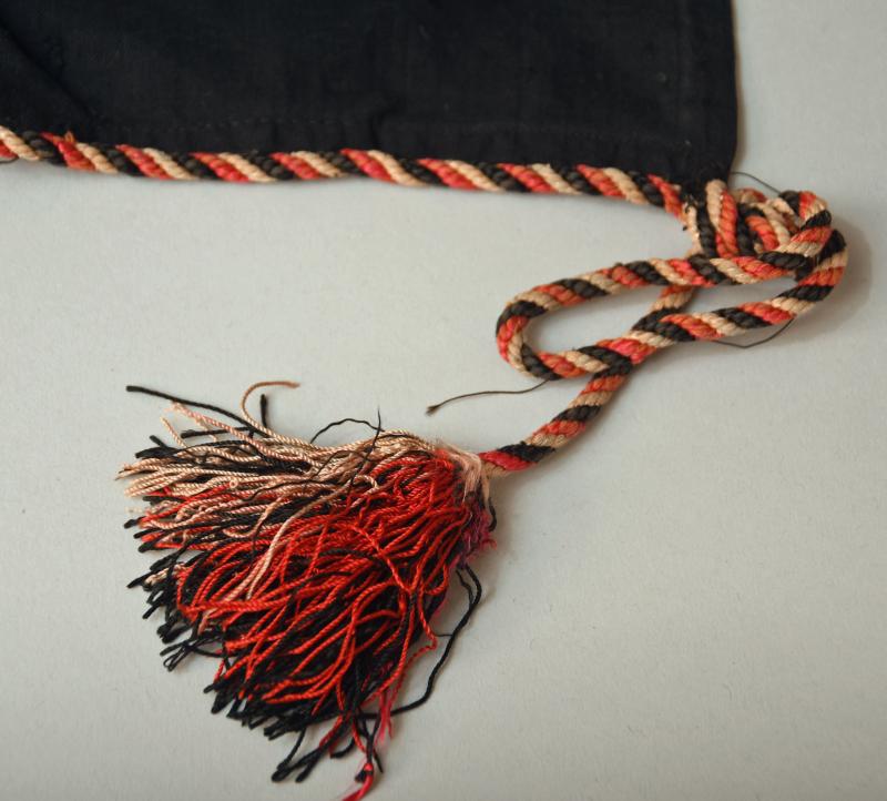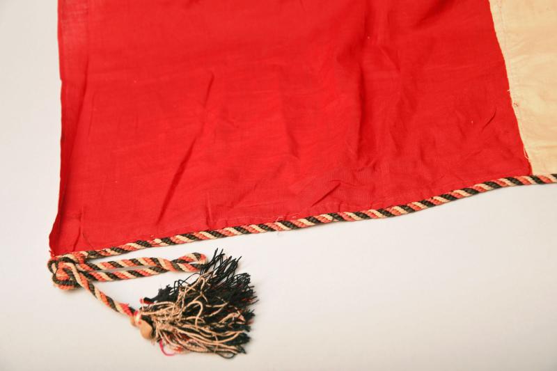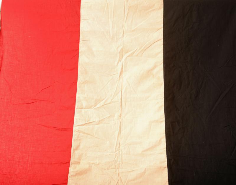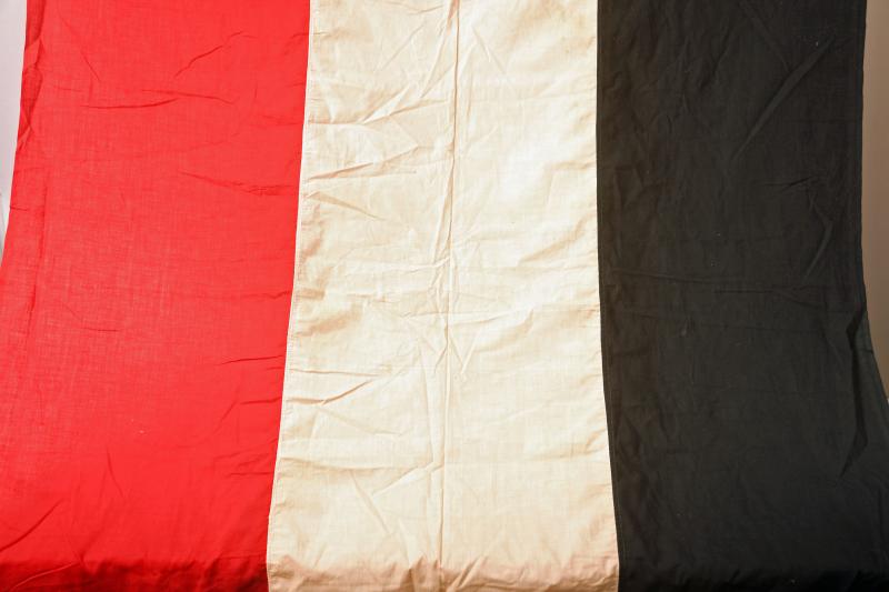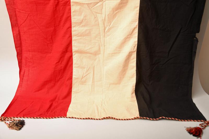 A nice black, white and red German flag is drape form measuring 200 x 110cm. The upper edge has the twisted black, white and red cord of the national colours. Slight staining, no damage.