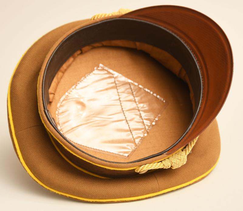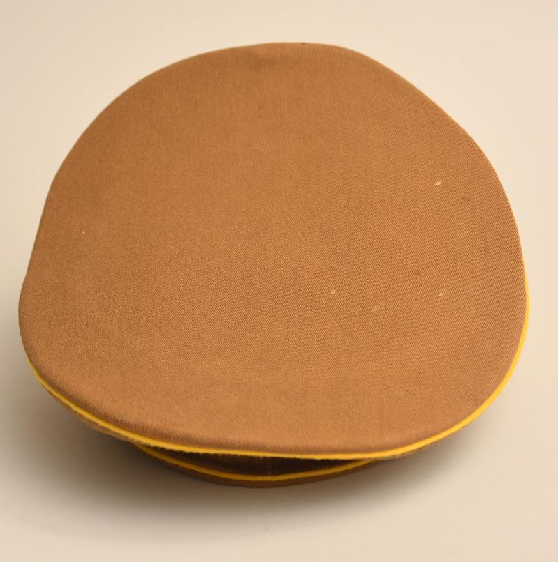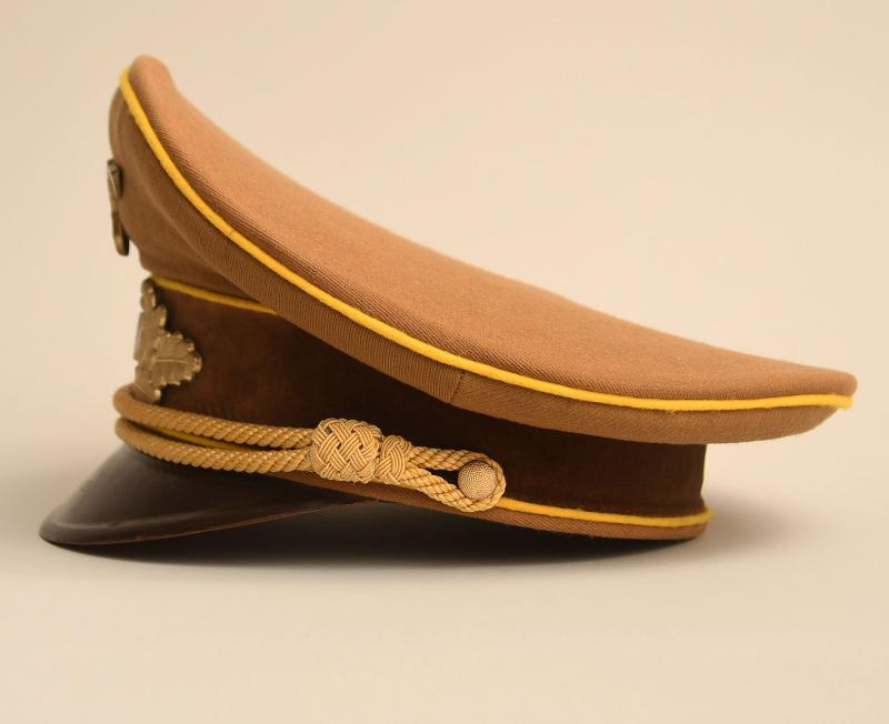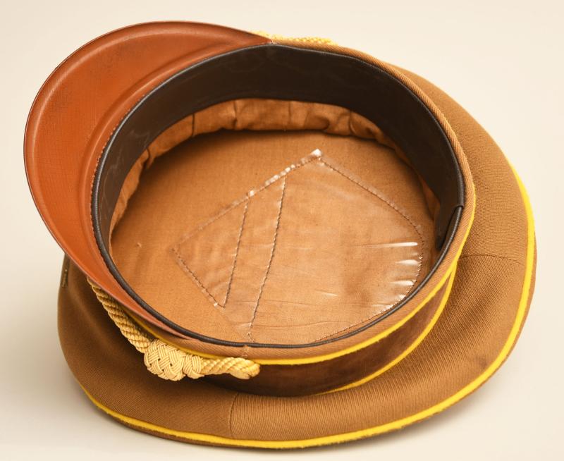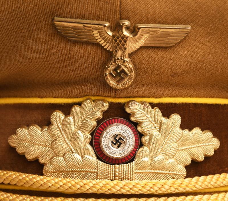A very fine lemon yellow piped political cap For the highest level of the political party the NSDAP. Constructed in the heavy grained political brown material, lemon yellow piped, brown velvet centre band, matched set of gilded national eagle and cockade, with multi-enamelled swastika centre, gold cap cords and side buttons. No moth damage anywhere to the cap, the interior having a dark brown leather sweatband, light tan brushed cotton interior lining, with its canvas RZM ticket in place. The centre celluloid lozenge all intact without any maker or retailer’s name below.