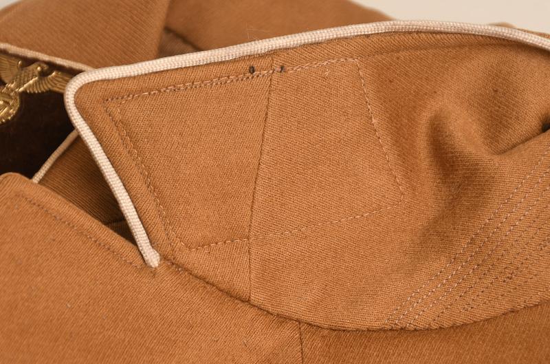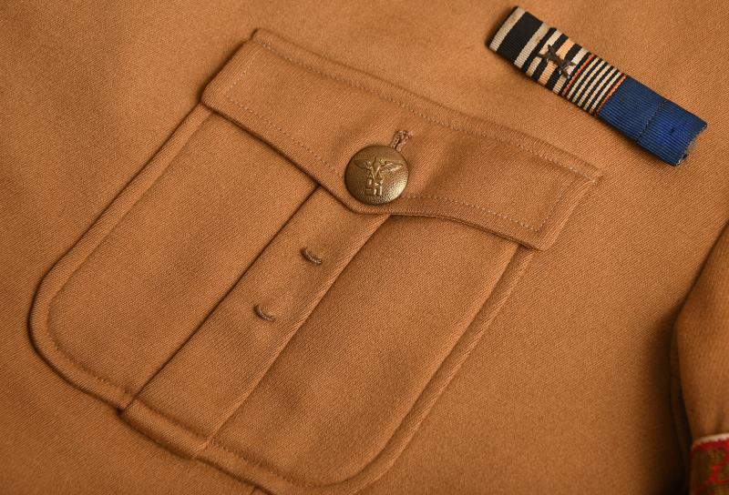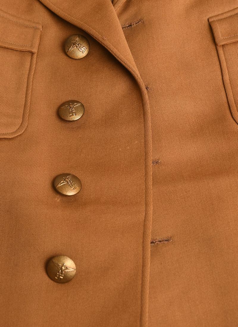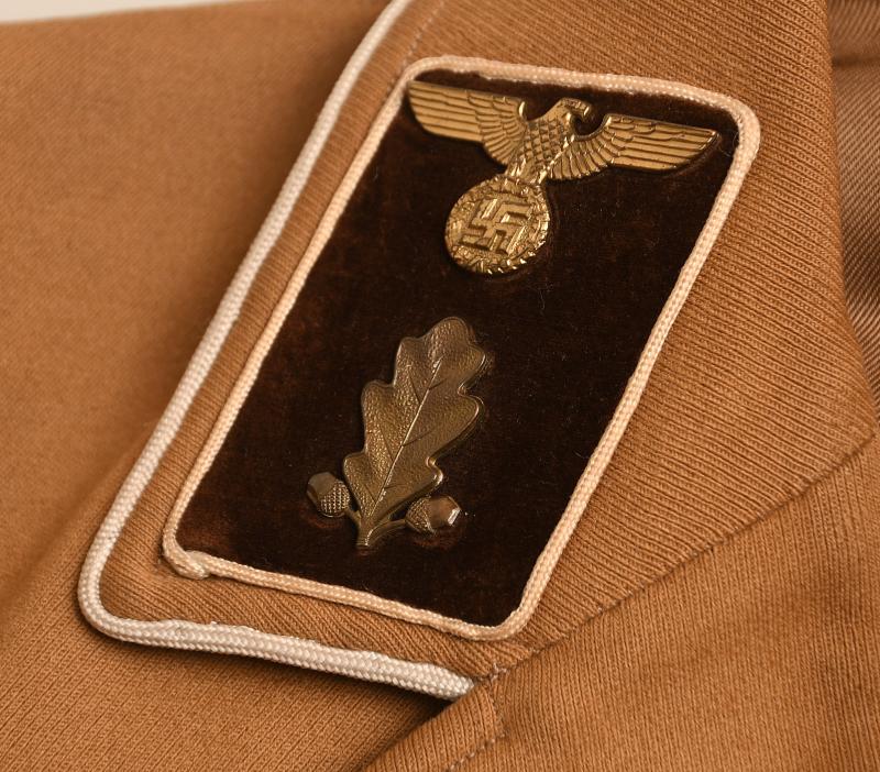 A highly impressive and excellent condition tunic and trousers of a NSDAP Abschnittsleiter ( section leader). Constructed in the classic political brown heavyweight material, four pocket construction, Open collar style four button closure. Kreisleiter white piped to the collar and to the 4 th pattern 1939-1945 collar patches, the gilt to the metallic elements of the collar patches good. Laid onto the brown velvet backing material. The multi-constructed political armband for the matching rank without any moth damage. All of the buttons being of the political style with the raised political eagle over swastika, a five section medal ribbon bar fitted, minor splash stains to the lower right hand sleeve as the tunic is viewed, a large size tunic, accompanied by a matching set of political breeches totally free of any moth damage or staining the pocket flap buttons and the one rear pocket button all of the political style.