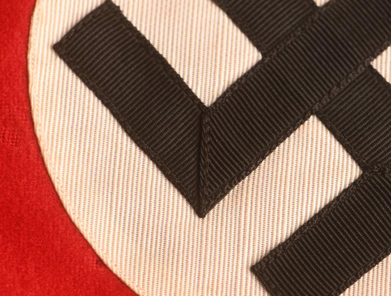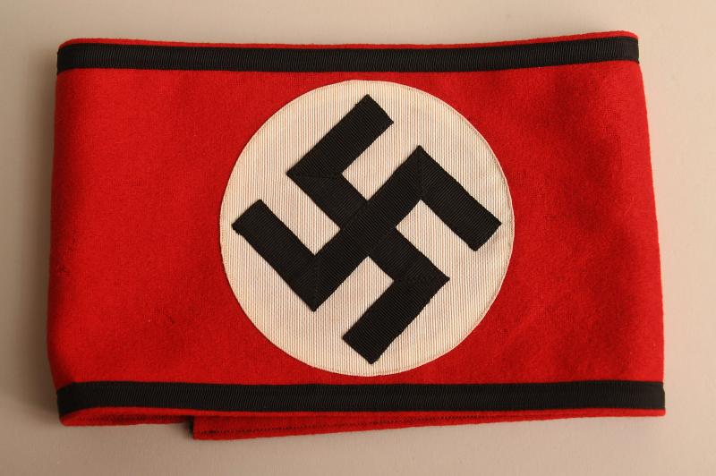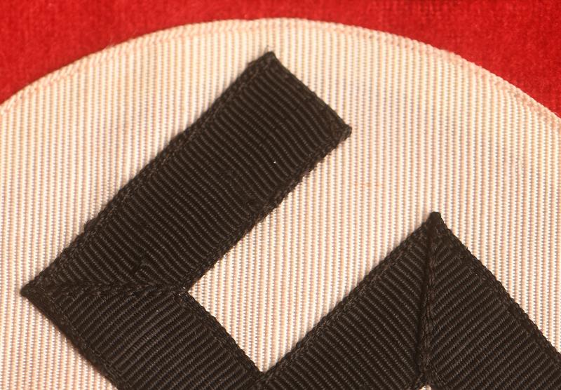 A very good condition and unused, multi-constructed black swastika on a white circular field, laid onto good quality armband red cloth. To the reverse side the original paper RZM ticket still intact. 3 tiny moth holes.
