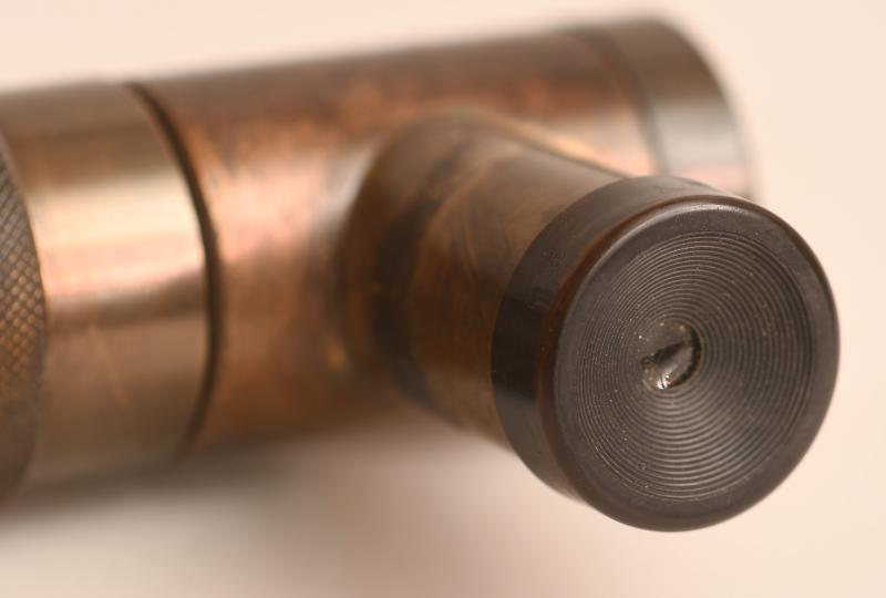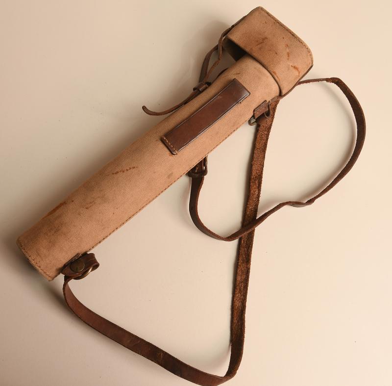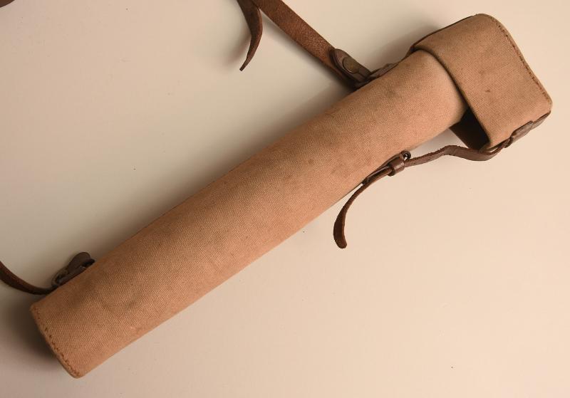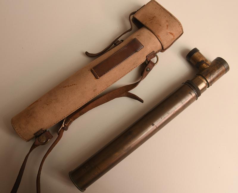 A very nice condition trench periscope, brass body, 34 cm in length, extending to 56 cm, excellent optics, marked to the exterior body the Prismascope, with London maker’s address, in its canvas and leather carrying case.