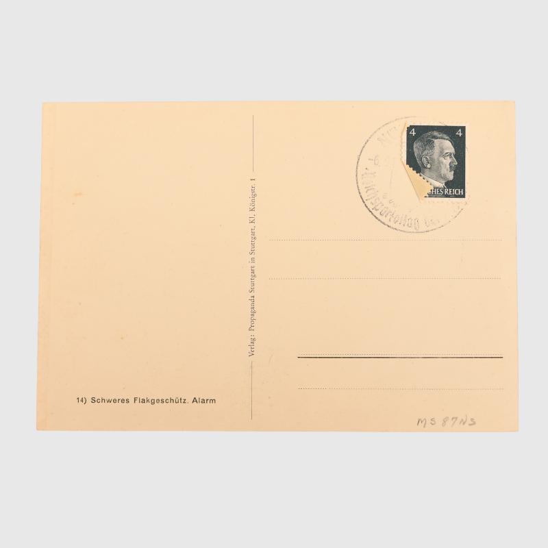 A scarce postcard of a Luftwaffe flak crew running to action, unused condition but with cancellation frank and Adolf Hitler stamp.