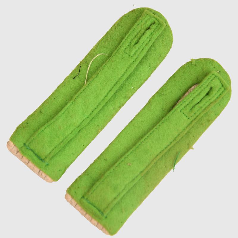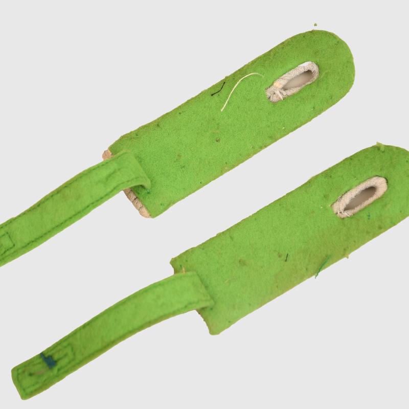 A pair of well worn light apple green wool based shoulder boards for an Army Leutnant. Some oxidisation to the silver wire. Two holes to the centre of the shoulder boards where what appears to be a regimental number 2 may have been removed. These are a rare pair of shoulder boards.