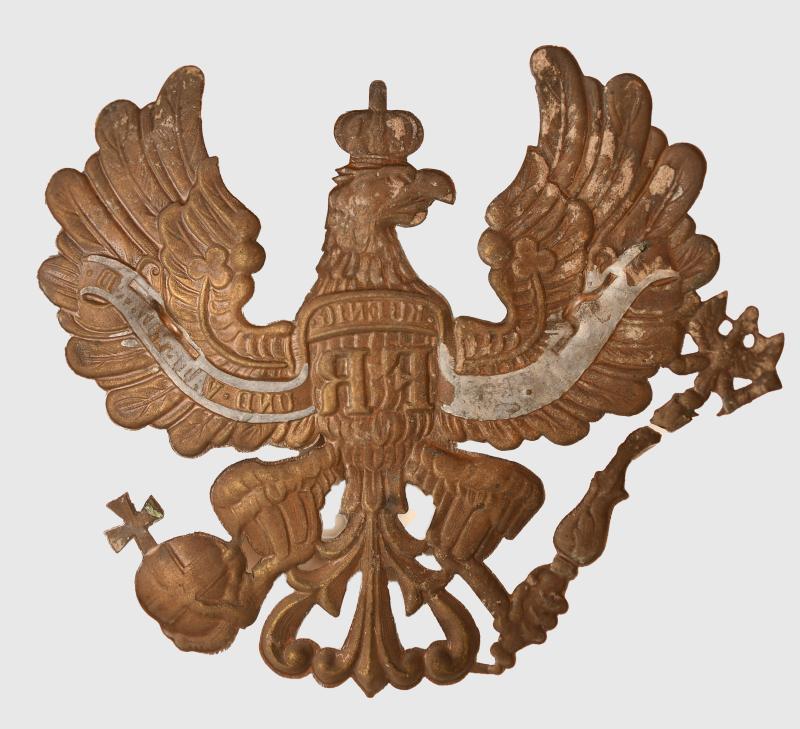 The standard stamped brass non cut out crown helmet plate for the Prussian enlisted mans pickelhaube. Nice condition. All lugs present.