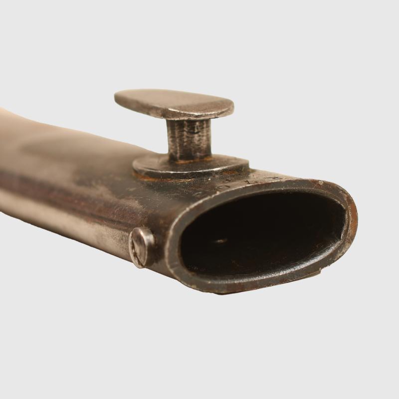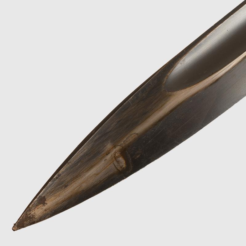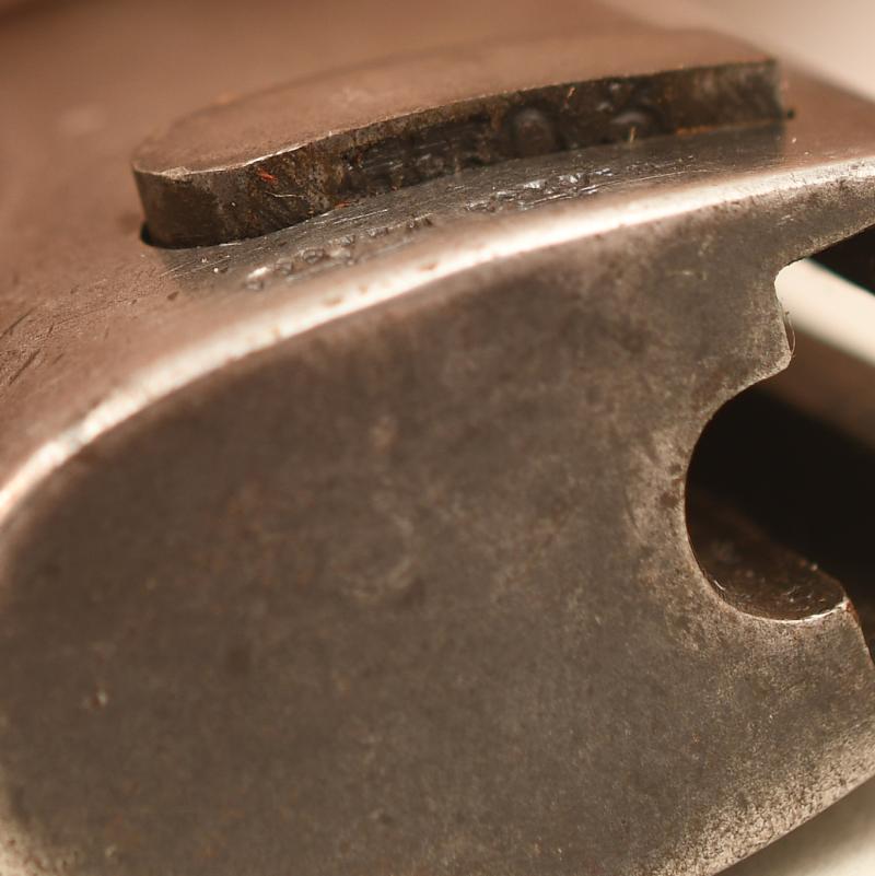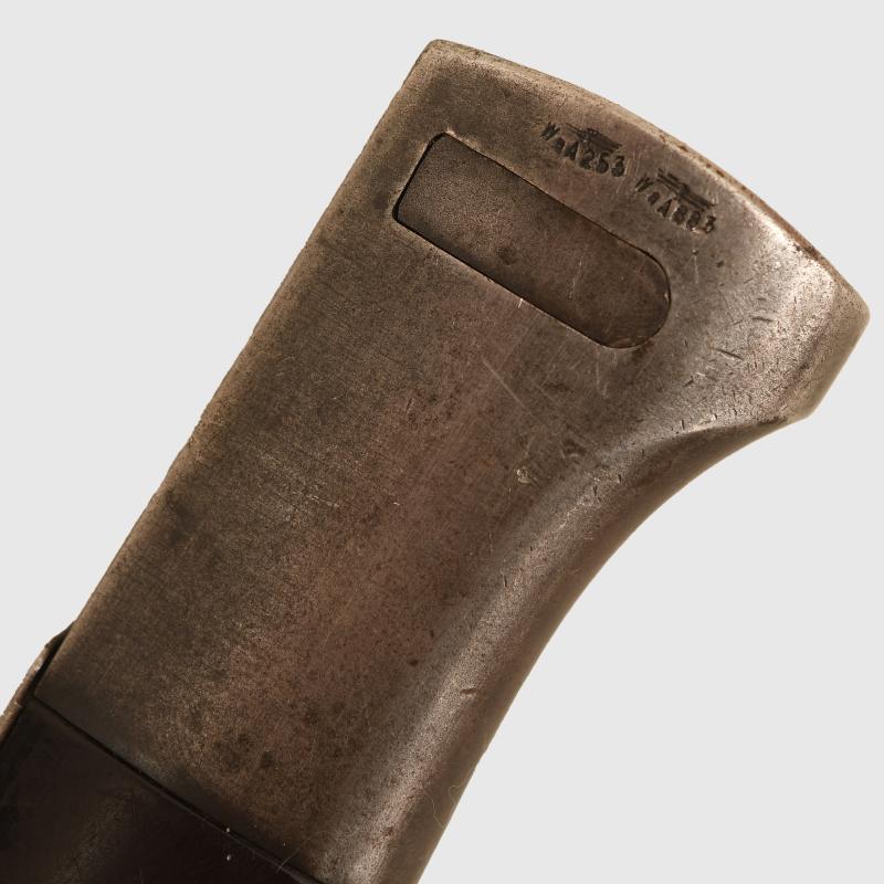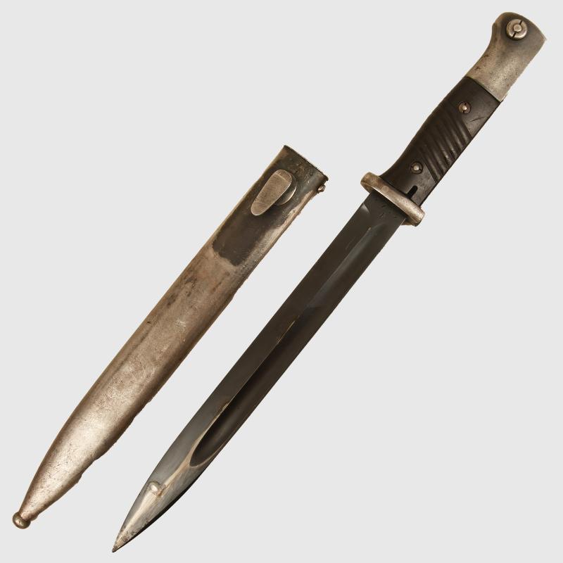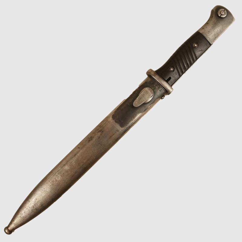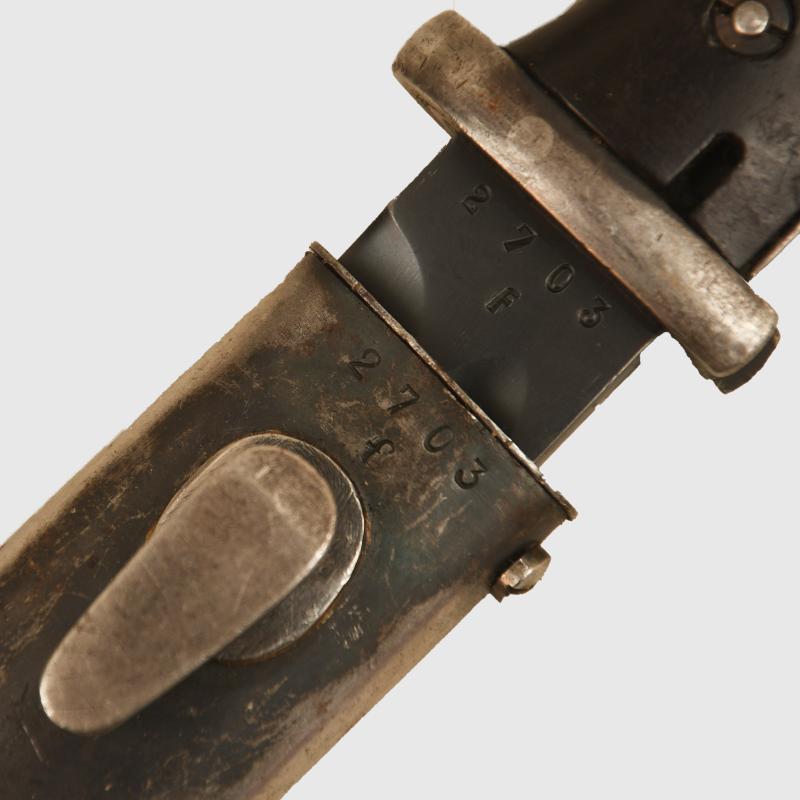 A lovely blade having all original finish remaining, numbered ‘2703’ with matching ‘2703’ to the scabbard. Undamaged plastic grips. Double waffen amt markings to the upper pommel with its rifle retaining system intact and working correctly. The scabbard has lost all of its blued finish except in the area, which was originally protected by a leather frog, which is now missing. Also marked on the reverse side of the blade and the scabbard ‘CRS 40’.