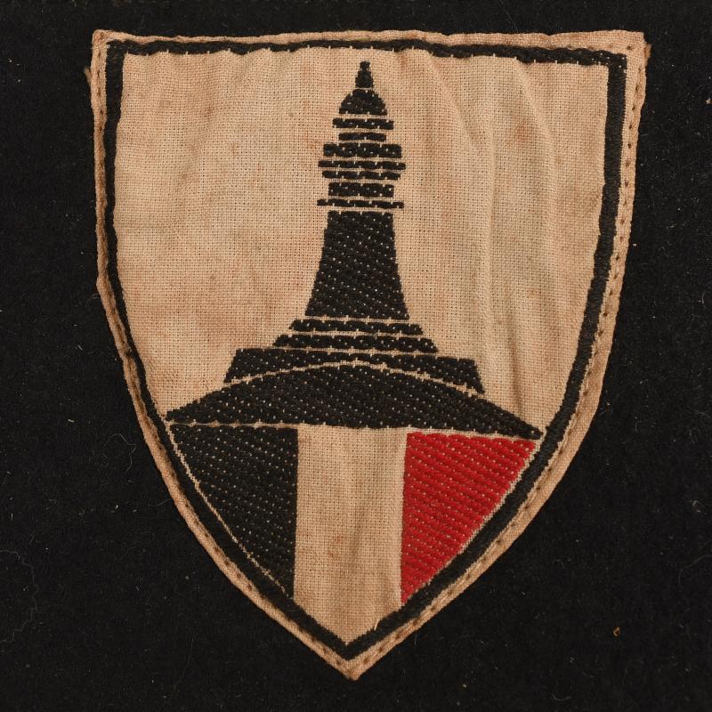 A nicely constructed all heavy blue felt armband with the stitched overlay shield shaped Bevo woven insignia of the Kiel lighthouse being the insignia of the Old Comrades Association.