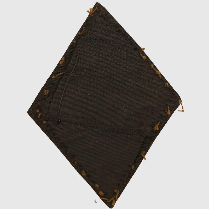 2nd pattern diamond shaped very nice quality Bevo silver wire embroidery of the NSKK eagle on a motor wheel. Stitches remain where removed from a tunic.