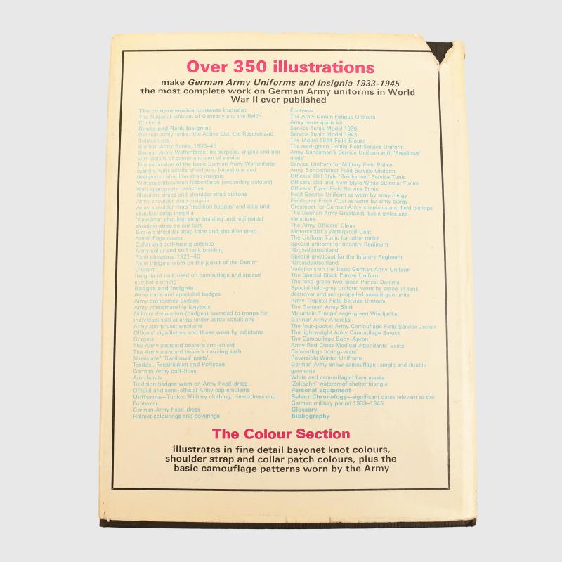 Published many years ago in 1971, this is the 2nd edition 1973, still today used heavily by most dealers and collectors, although it has been superseded by many other works, this is still a very good reference for the German Army of WWII. Original fly leaf, which does have some slight tears and foxing to the edges.