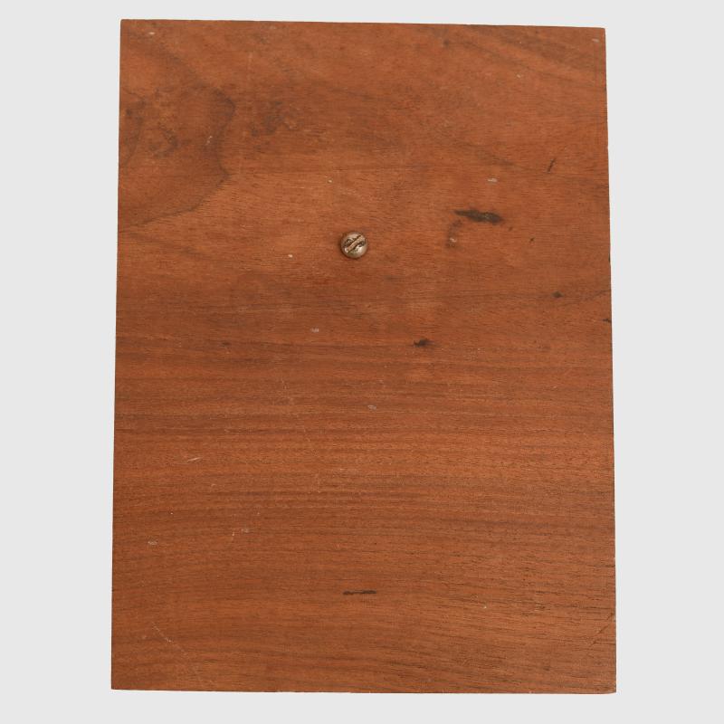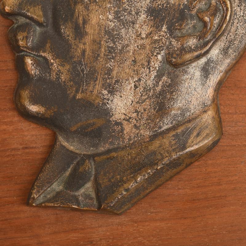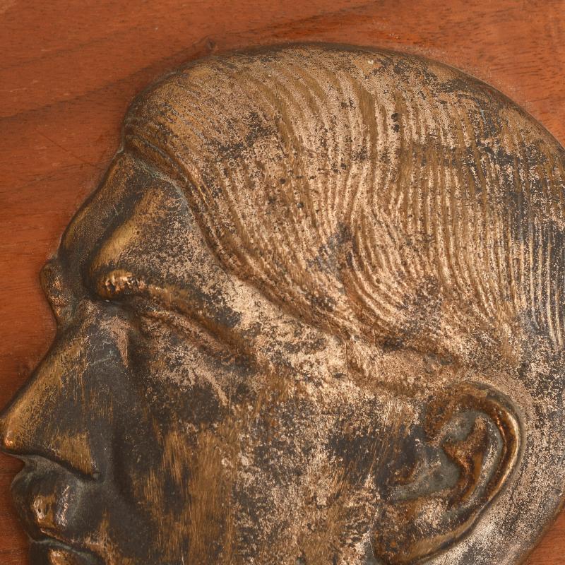 A heavy cast metal side on view of Adolf Hitler mounted on a wooden base measuring 19 x 13.5cm.