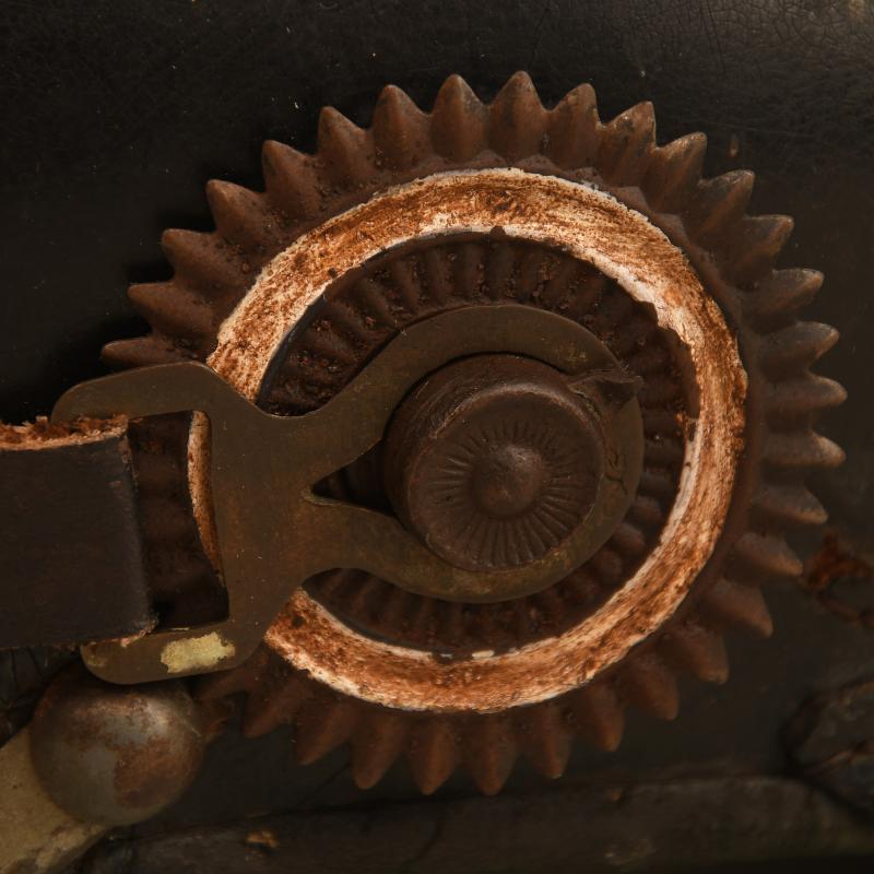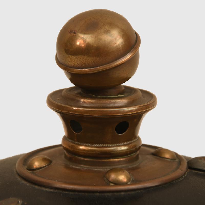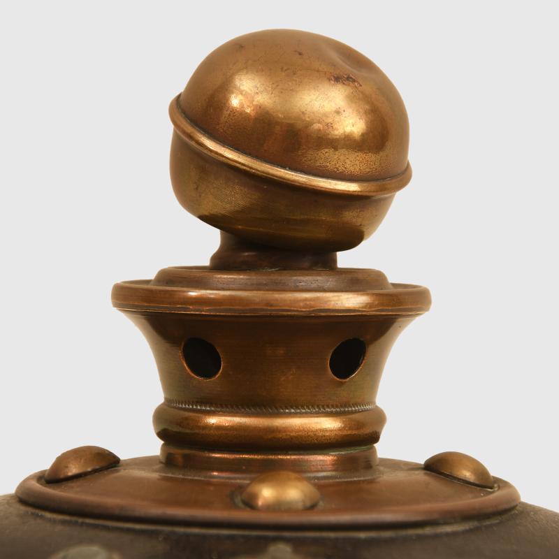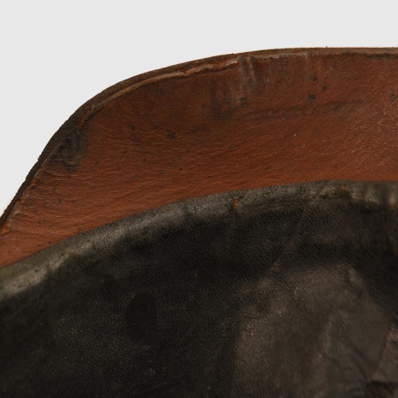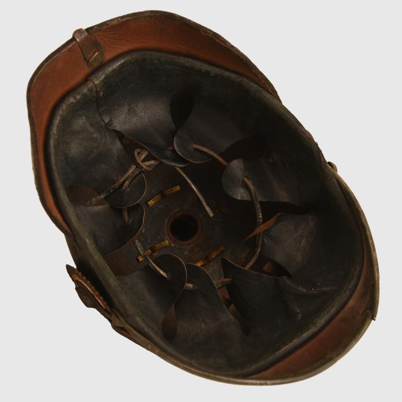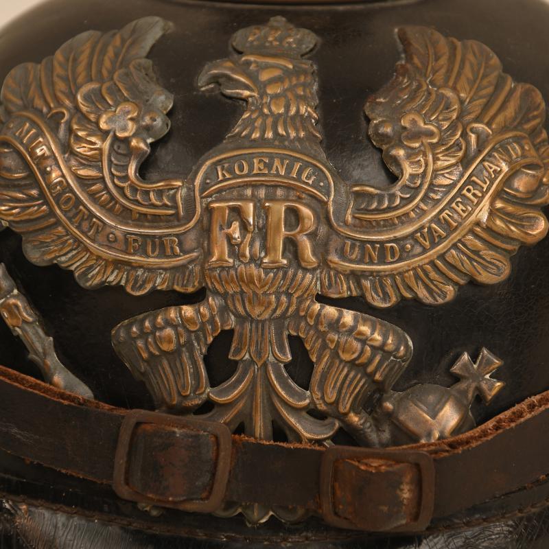 An interesting helmet being a War economy helmet with a mixture of brass and chemically patinated field grey fittings, helmet is non-size stamped but on test it appears to be 53 or 54, excellent skull, slight congealing to the front and rear peaks, but both are firmly attached to the main body, the rear trim is in field grey, the ball top and ball base in brass, the Prussian helmet plate in brass with traces of field grey edges, strap posts are field grey as are the small type buckles to the thin chinstrap. National and state cockades present, one split to the front peak trim, the helmet has suffered battle damaged, the ball top is at a angle on its base, to the interior the nine tongued liner in black leather all intact and supple, with its original drawstring, very clearly ink rubber ink stamped A.R.18 to the interior skull,(artillery regiment 18).