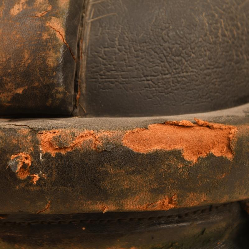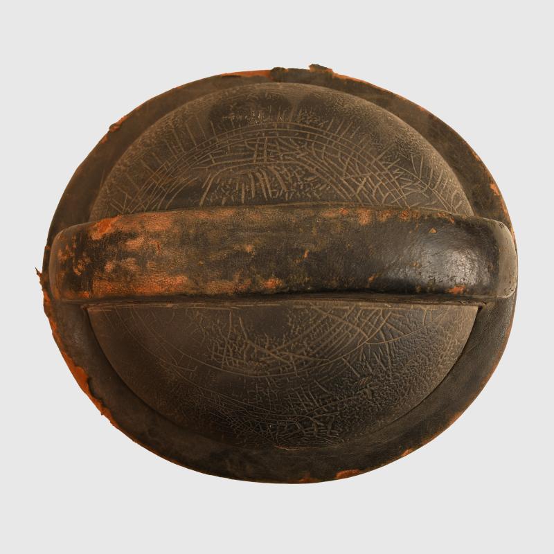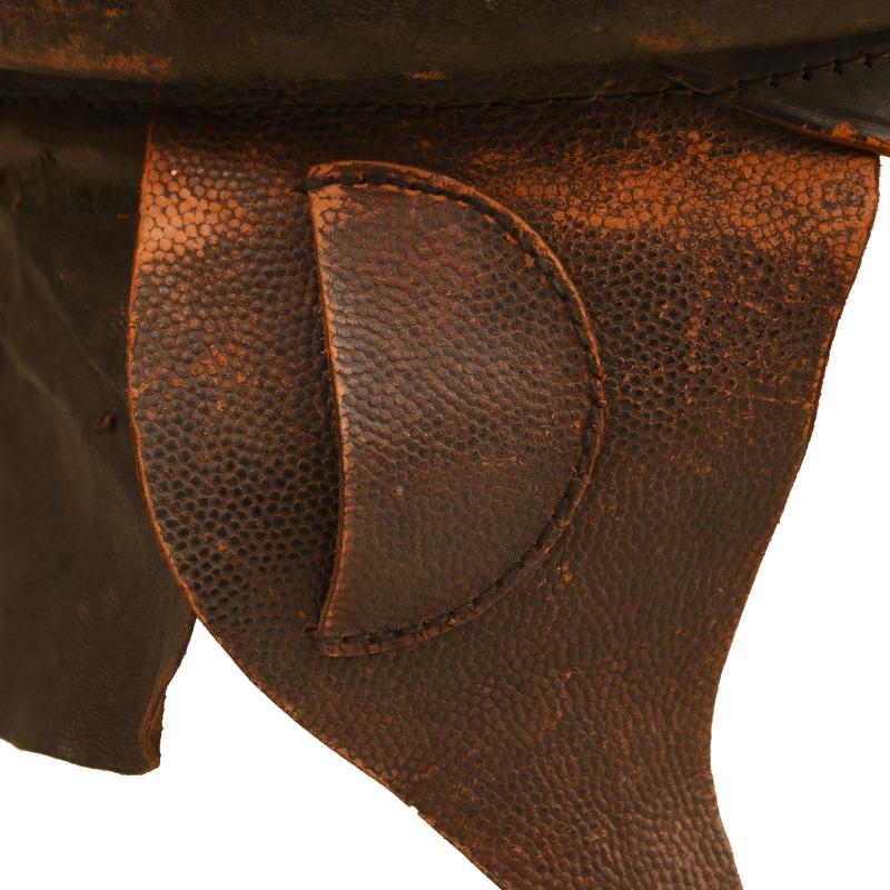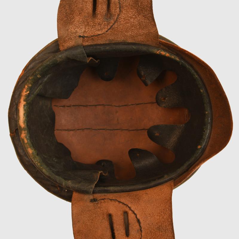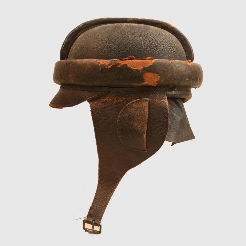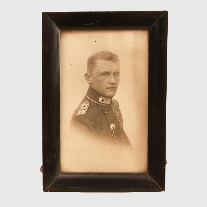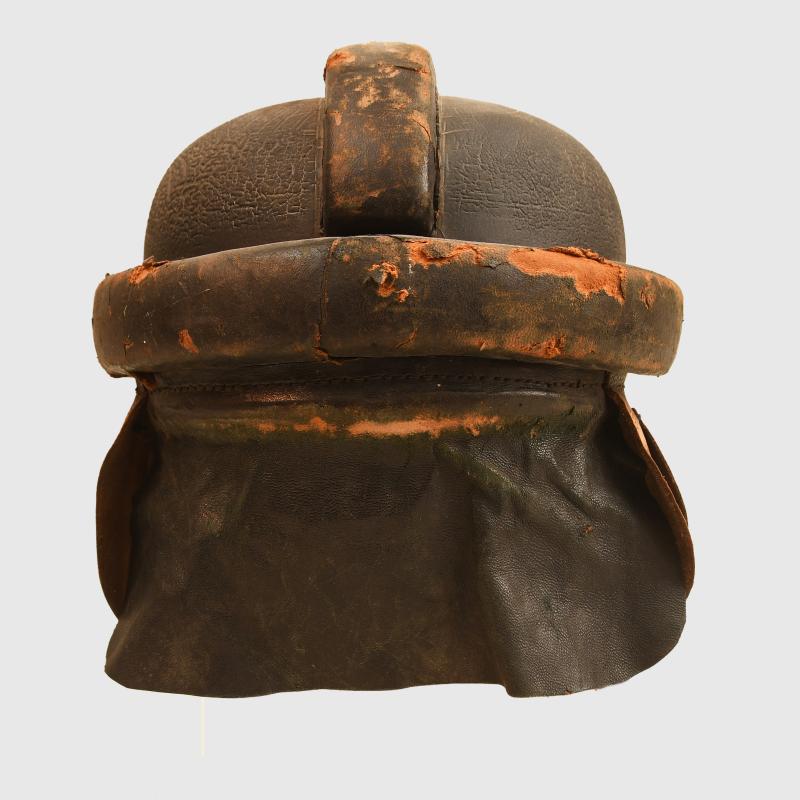 A good small group comprising of a well service used Imperial German flying helmet of the standard form, the outer leather crown is crazed overall through heat, some abrasions to the leather of the edge and the crown cushion, complete with its front peak, ear protectors and neck flap, the neck flap is issue stamped however through age and dirt it is difficult to clearly make out any of the markings. Inside the front peak the initials ‘H.O?’ have been hand applied. Accompanying the helmet is a studio portrait, head and shoulders of an Imperial German aviator wearing the Litewka tunic with his flying wing propeller shoulder boards clearly visible. The picture is slightly faded, situated in its black wood frame, interestingly the backing of the frame including its stand is profusely covered in impregnated Iron Crosses. The condition of the frame and the picture identical in storage staining to the helmet indicating that the picture and the helmet more than likely belonged to the same man.