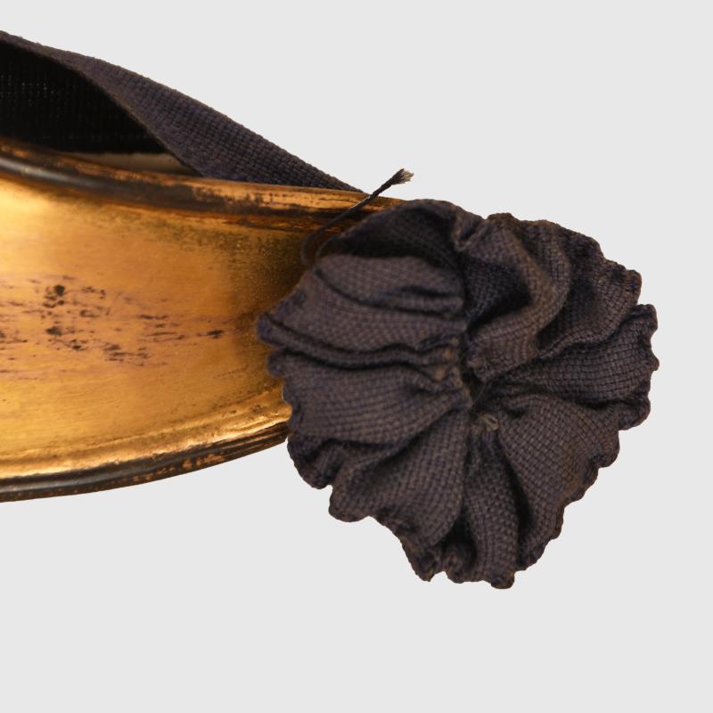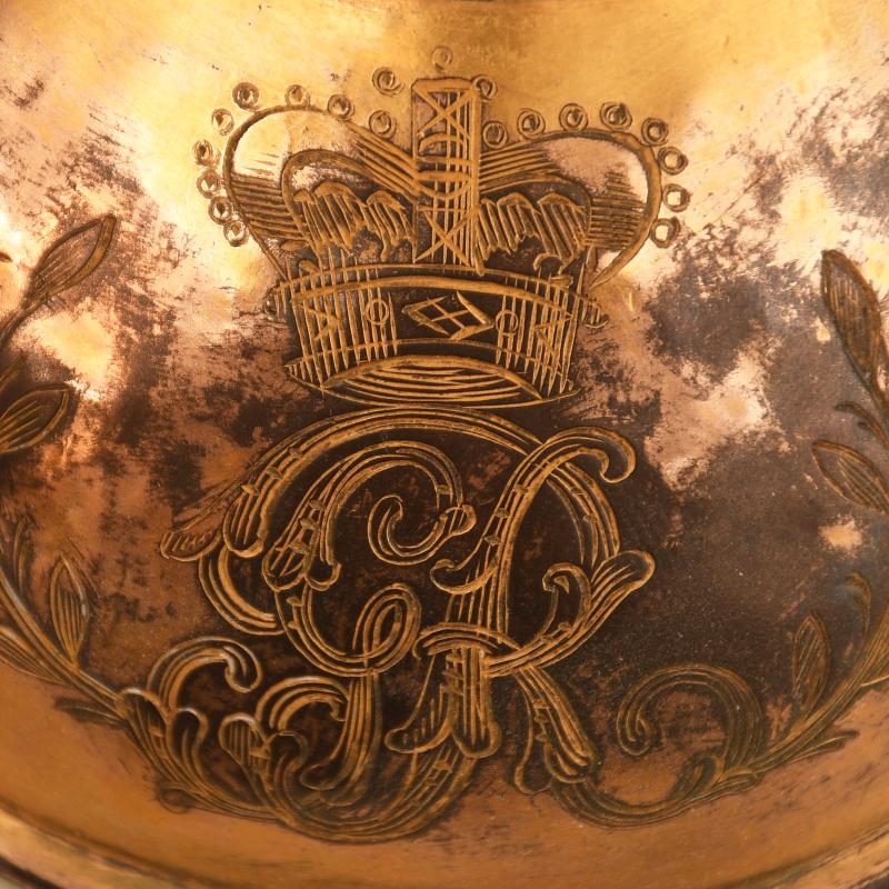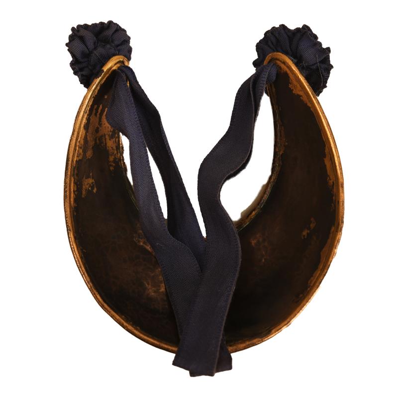 A very nice condition Georgian officers universal Gorget with its original blue ties and rosettes, GR scroll under the Georgian crown, some slight loss of gilt to the central area.