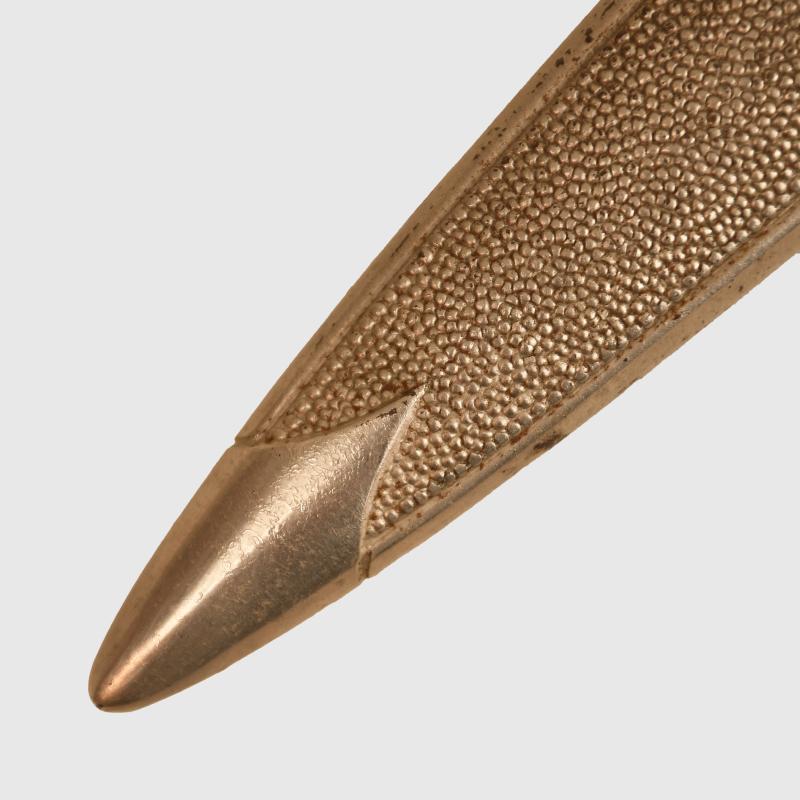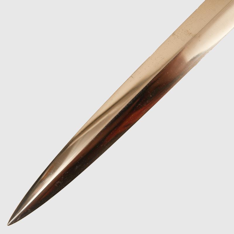 An extremely nice Red Cross officers dagger, the blade absolutely mint with all its bright cross grain finish remaining, these blades were never maker marked. The original leather washer fits between the upper reaches of the blade and the Red Cross cross guard. The cross guard and upper pommel of these daggers are always quite susceptible to corrosion, this is a super example that has not been affected, there are just two minor areas on the top back edge of the upper pommel where the plating has lifted away otherwise it could be described extremely good condition. The grip also excellent with one minor little mark half way down the front side of the grip. Complete with its original dress knot, fitted into its excellent undamaged scabbard, which has slight thinness to the plating on the side edges, two minor discoloured spots to the lower half of the pebblying on the front side and the plating thin on the reverse side of the scabbard bands. The two upper screws to the throat are unturned. Complete with a nice set of service used brown and silver straps. The unmarked belt clip working correctly. All of the springs on the attachment clips also in place and working correctly. More extensive, extra images can be seen on our new Premium website, type in regimentalsmilitaria.co.uk in to your web browser.