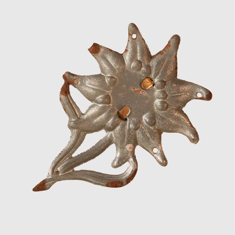 The two-piece badge stamped steel with pre-punched holes for sewing to the M 43 Cap, some gilt remaining to the central rose, slight rust to the tips.
