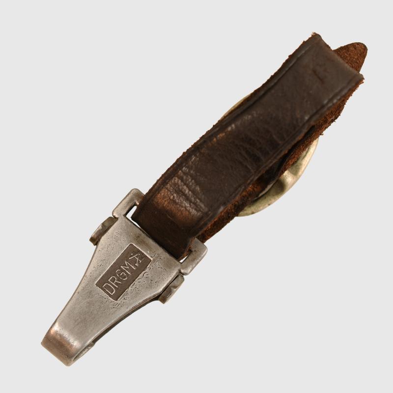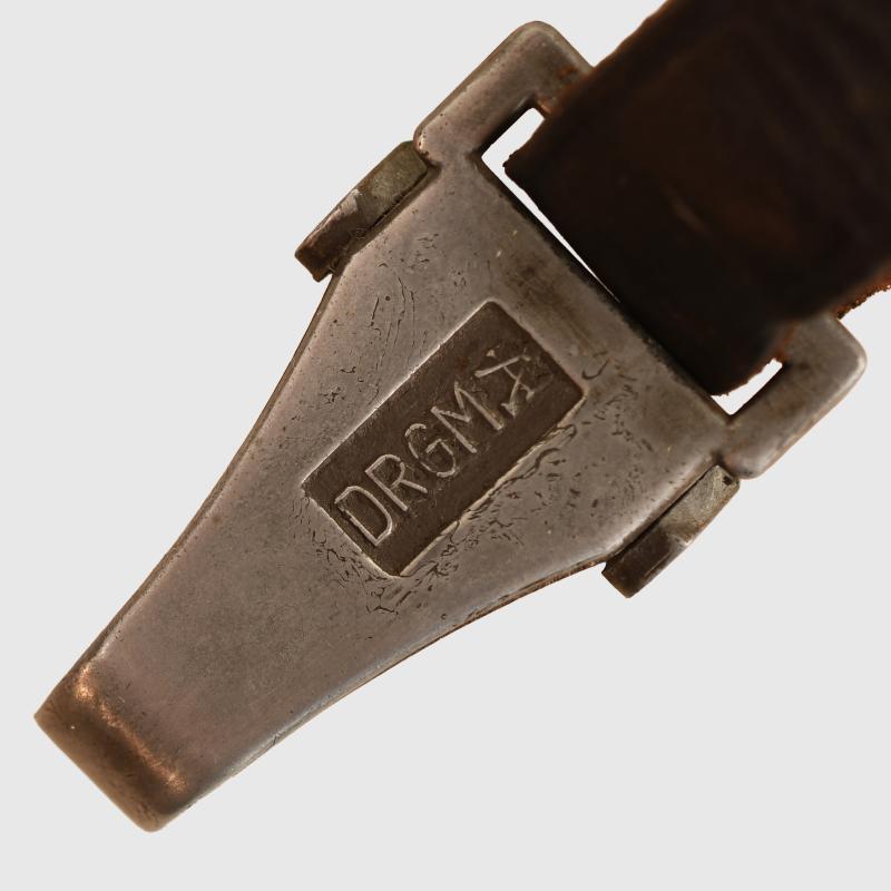 A well worn suspension strap in leather for the late war SS dagger, having a DRGM marked late war constructed clip, the nickel oval buckle in place with the small leather loop missing.