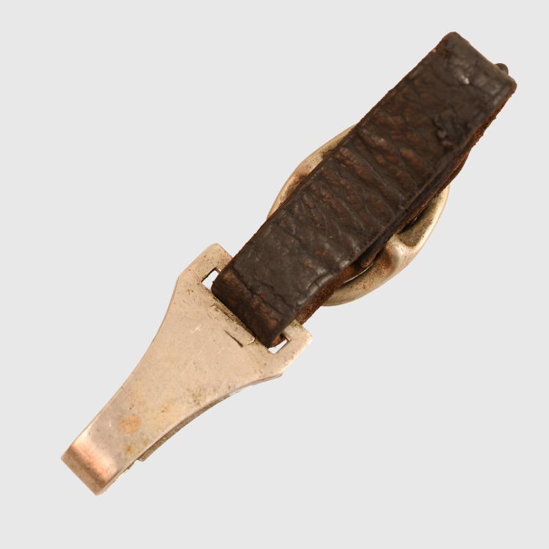 A well worn leather suspension strap with all nickel fittings for the SS man’s dagger, spring broken in the clip, small leather loop missing, and strap slightly shortened.