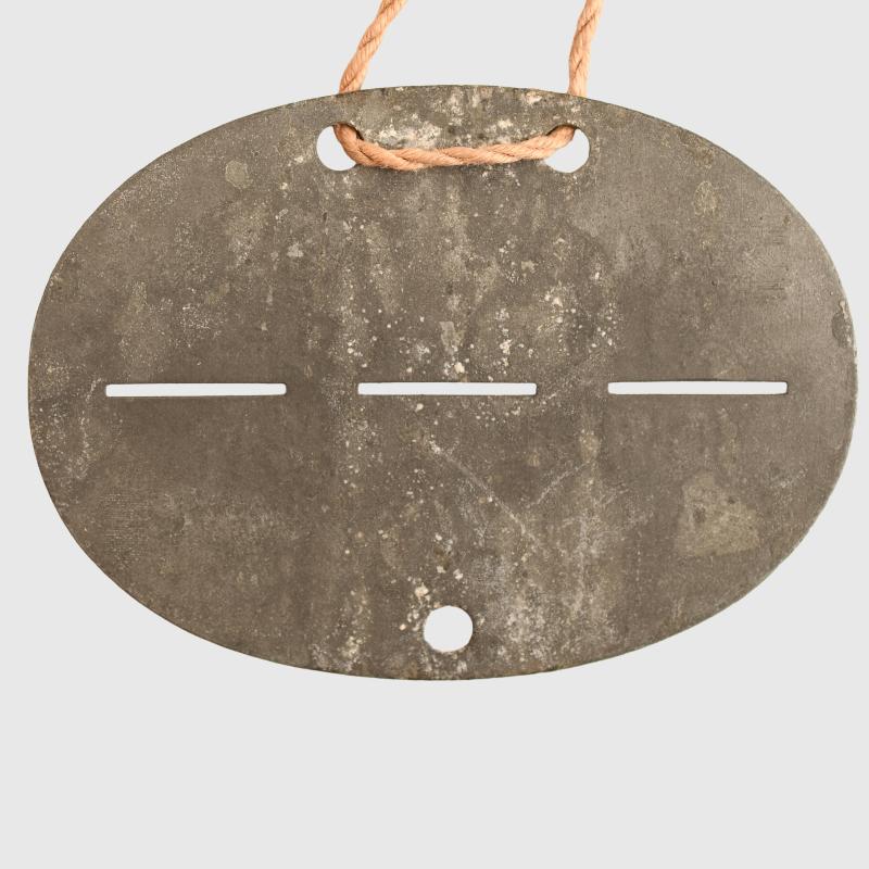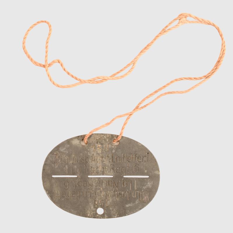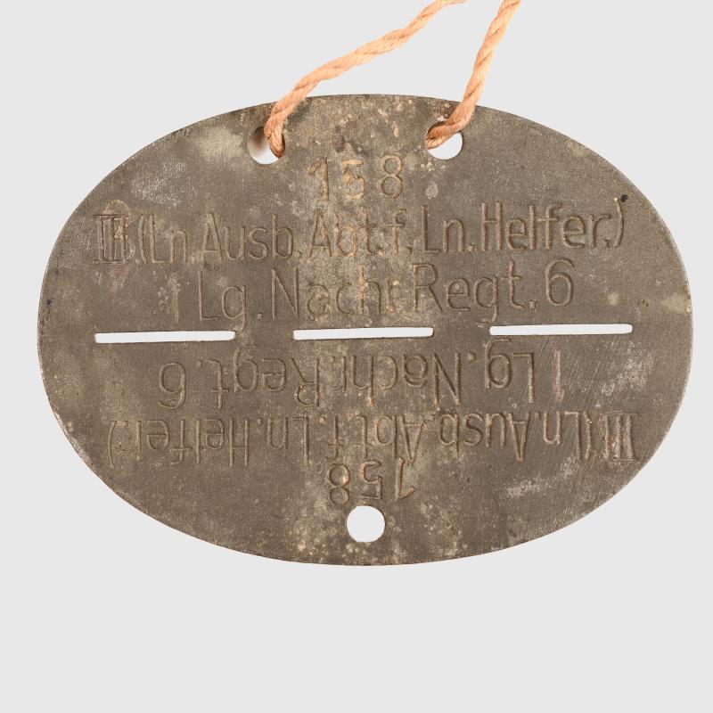 A rare one piece zinc spittable disc for a Luftwaffe female helper, disc marked 158 111 ( Ln.Ausb.Abt.F.Ln.Helfer Lg Nach .Rgt 6 ( Luftwaffe signals regiment 6 ) with original neck cord.