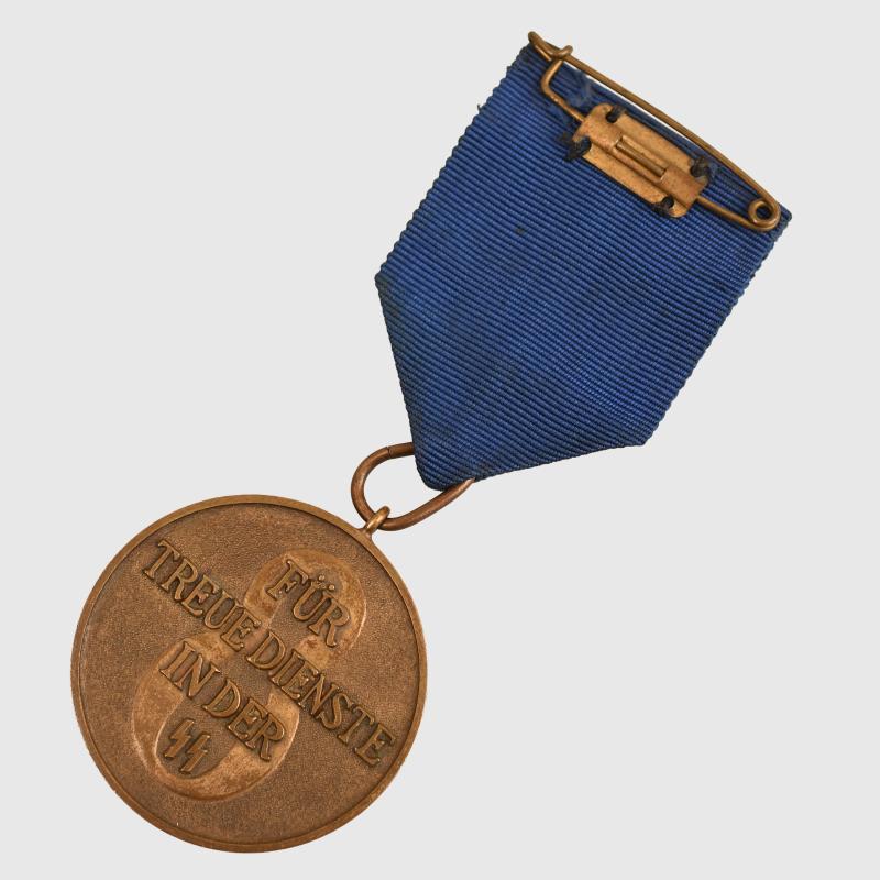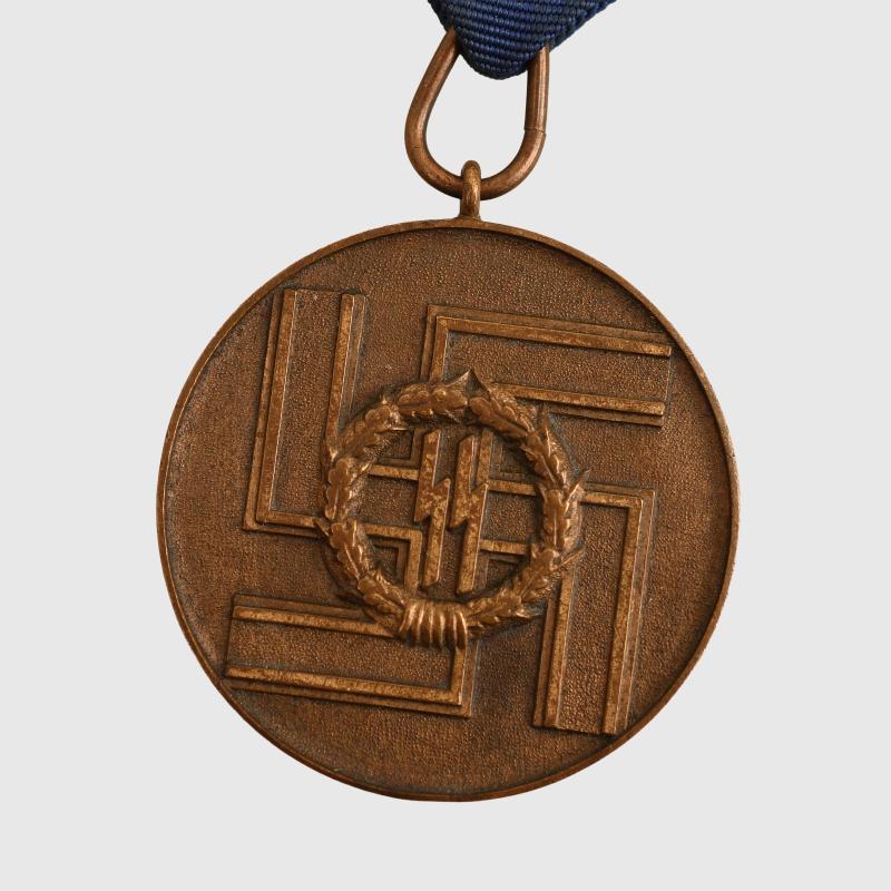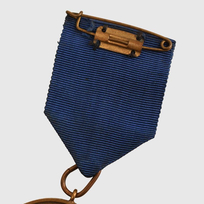Excellent bronze finish overall, good deep strike, good pebbling visible in the lower field with its teardrop type suspension, its blue water silk ribbon with its uniform fitting pin.