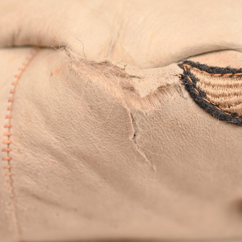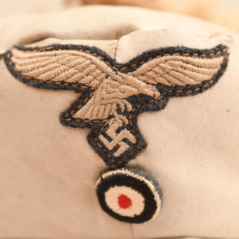 Some light discoloration to the skin lining. Two tears to the crown outer skin and one crack to the very edge of the front peak, complete with its Luftwaffe enlisted ranks machine embroidered eagle and matching cockade.
