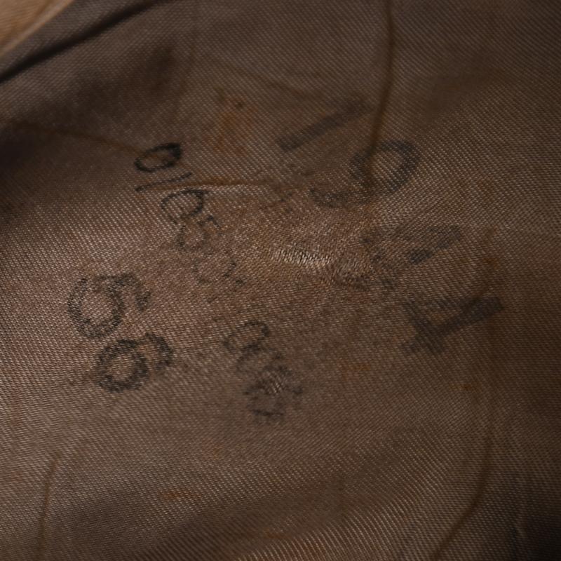 A field upgraded lightweight canvas Luftwaffe blue M.43 cap, double button style having field upgraded silver cord for an officer around the crown and retaining its original machine embroidered enlisted mans eagle and cockade. Blue grey rayon lining, stamped size ‘56’, well dated ‘1944’ with its RB number. Evidence of heavy wear use to the forehead area.