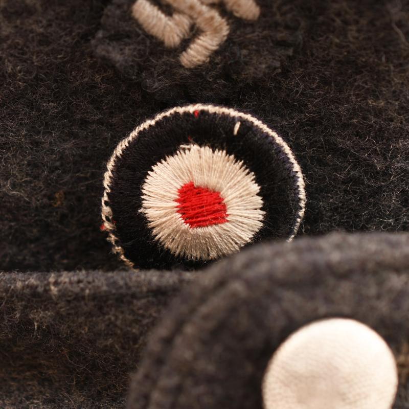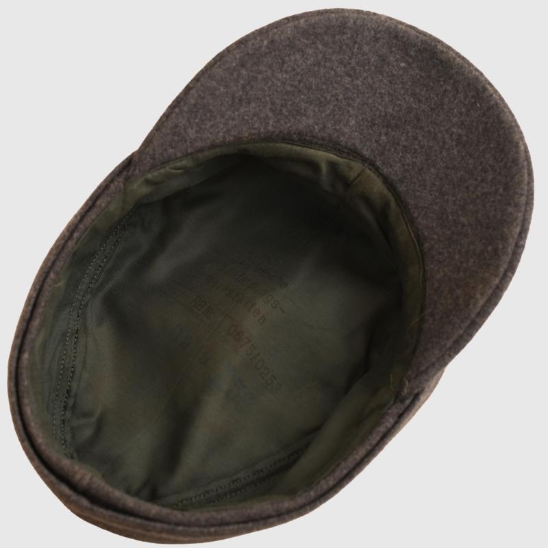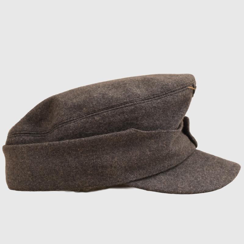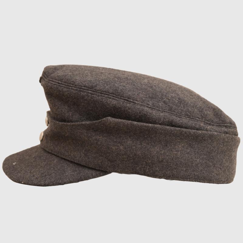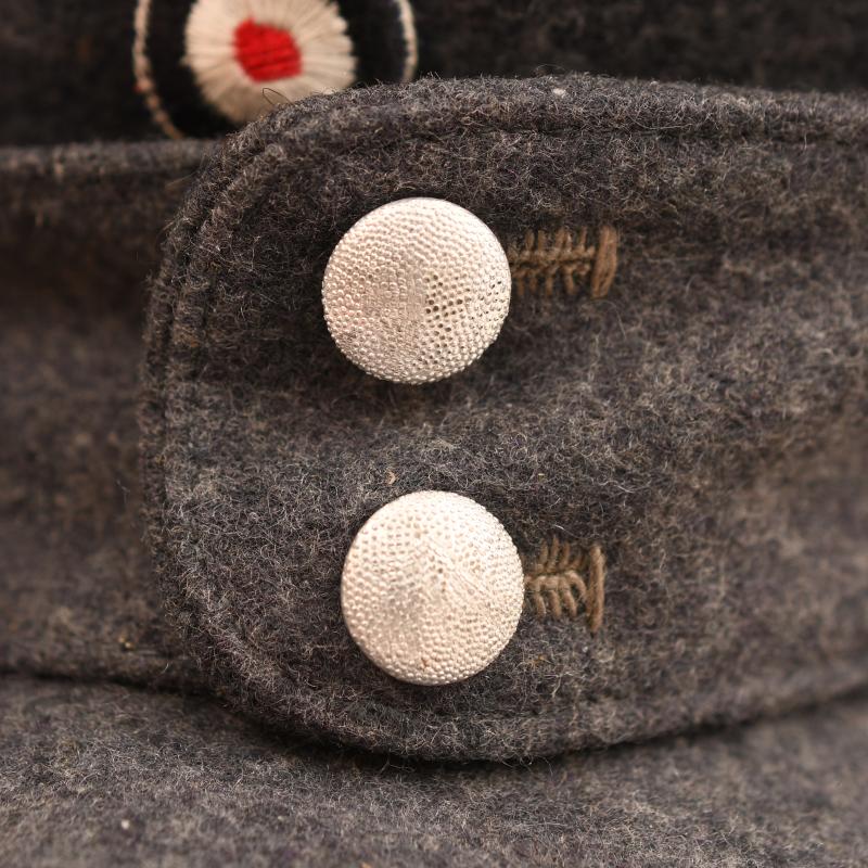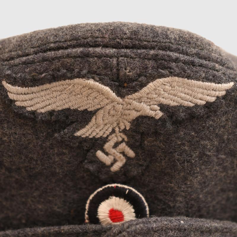 A very nice condition Luftwaffe bergmutze, standard enlisted mans cloth construction, no moth damage. Good nap to the cloth with its correct machine embroidered silver on Luftwaffe blue grey backing cloth, national cockade. Two pebbled silvered buttons to the front of the cap. Profusely stamped to the blue grey brown lining ‘DEUTSCHE SEKLEIDUNGS-WERKSTATTEN’ RB number and faint date ‘1943’ size ‘56’. Standard short peak, correct for a bergmutze.