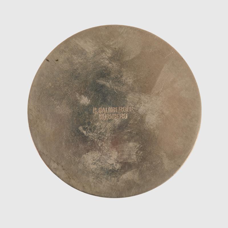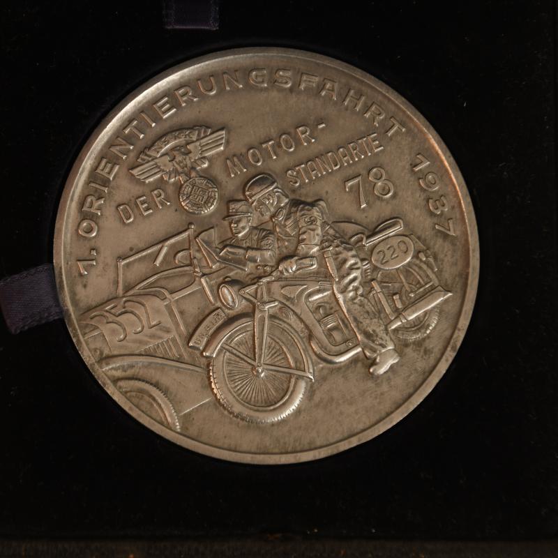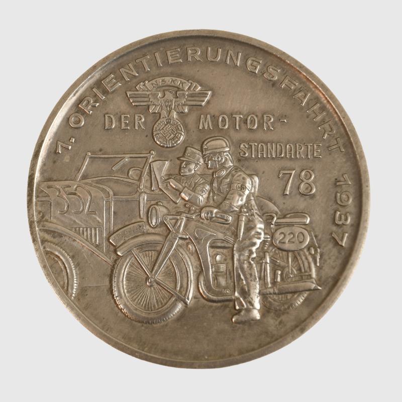 A very nice deeply struck heavy white metal circular plaque, maker marked ‘C.Balmberger, Nuremberg’ on the reverse side. The image at the front commemorates the Orientation Drive 1937 of Standarte 78 showing an NSKK motorcycle ride of a swastika armband talking to an either SA or NSKK man in a vehicle. Highly unusual.