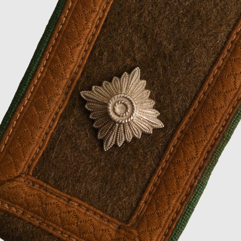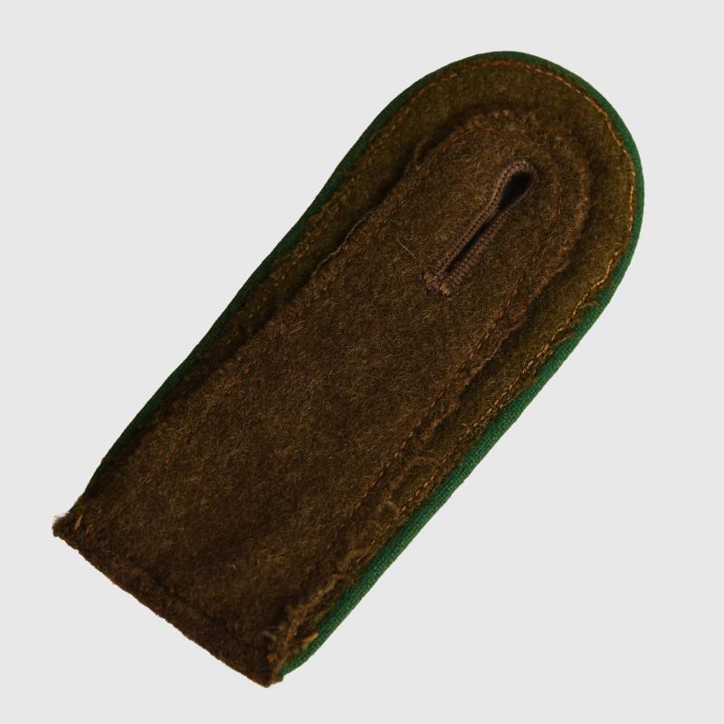 Single slip on shoulder board for an Afrikakorps mountain trooper, mountain green wool piping, tropical NCO tresse, one rank pip to the centre of the board with its wool and cotton slip on tab, the board of the early type made from the identical cloth to the Afrika Korps greatcoat material.