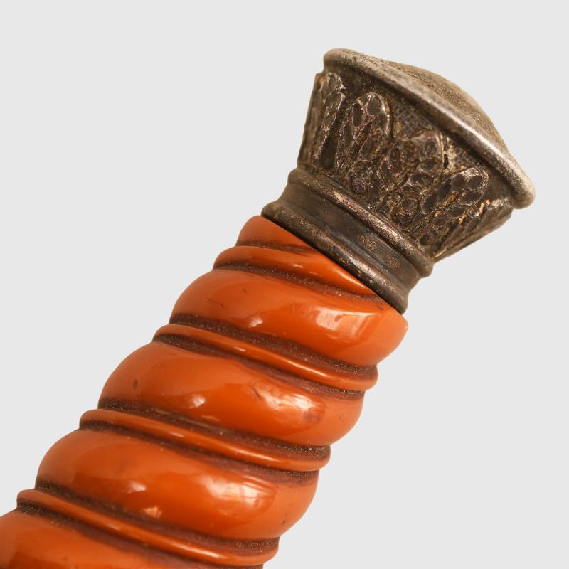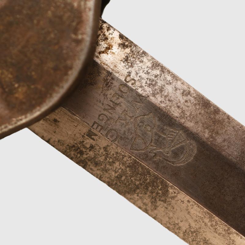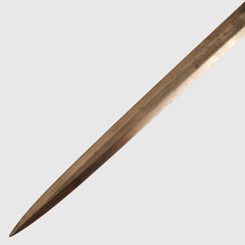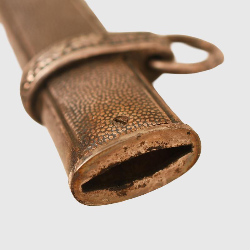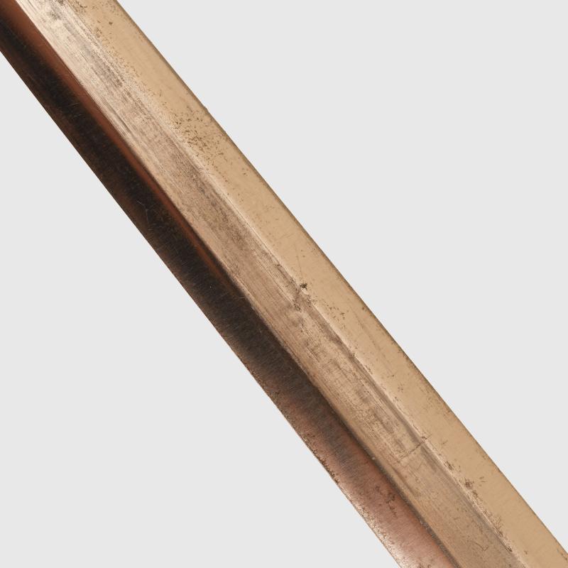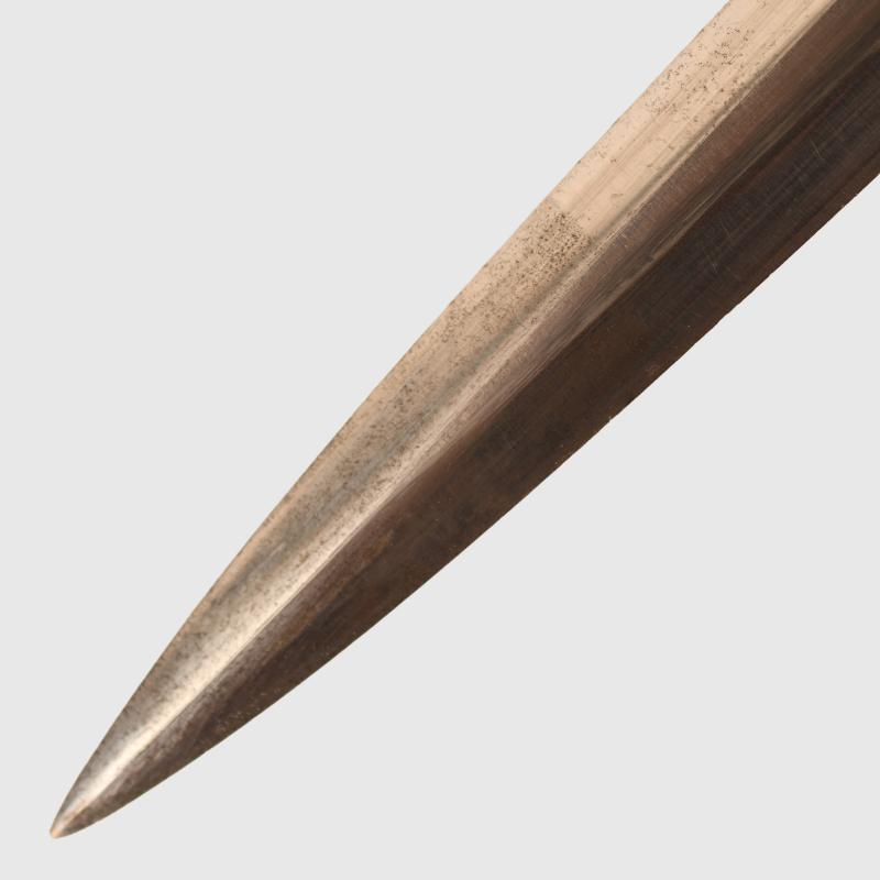 A full length blade manufactured by the company WKC, some light staining to the blade, good profile ridges clear and visible, all of the fittings which include the upper pommel, lower grip ring, cross guard and scabbard have all toned with light lifting of the original plating, deep orange grip without any damage. The sale of Knives, other Edged Weapons and Firearms are restricted to those aged over 18. Verification of age is required before purchase is concluded, this will include providing a scan of photo ID including your address and in some cases may require video verification by FaceTime or WhatsApp video, at Regimentals discretion, until formal laws on this requirement are enforced in the UK.