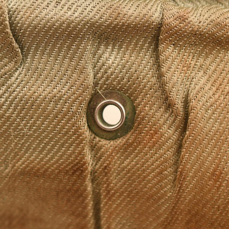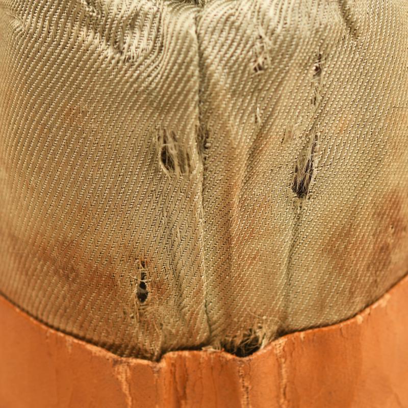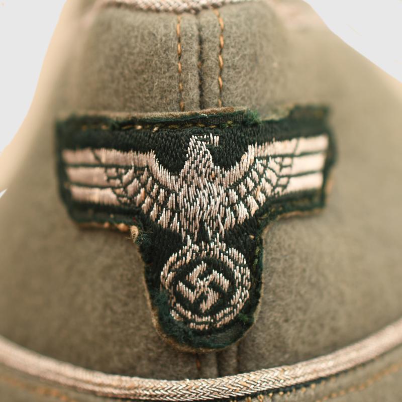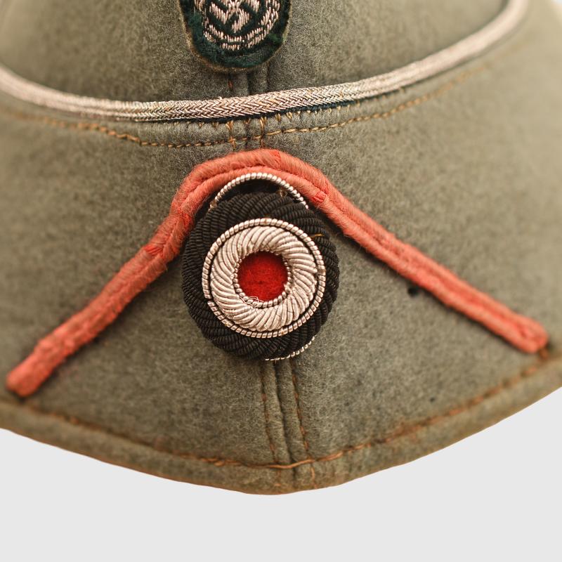 A small size high quality construction officers Field Grey Green overseas cap, possibly size 54. Two minor moth nips to the upper body. Silver waffenfarbe to the full surround of the upper envelope and the front scallop of cap. Pink waffenfarbe in a V shape around the central bullion wire cockade. The correct Bevo silver wire eagle appears to have been applied to a section of heavy duty cloth, then applied to the cap. Slight moth damage to the upper part of the eagle and the lower right hand wing tip. To the interior there is evidence of much wear use, the wearer has had fitted either originally or after purchase a half size in circumference inner sweatband just covering the forehead and half head area.