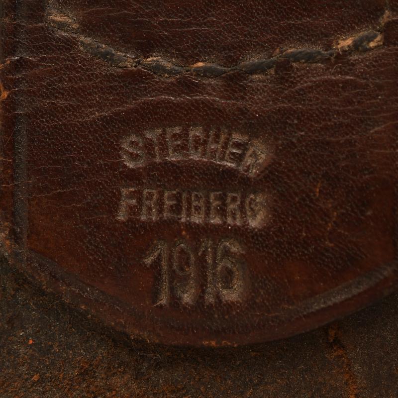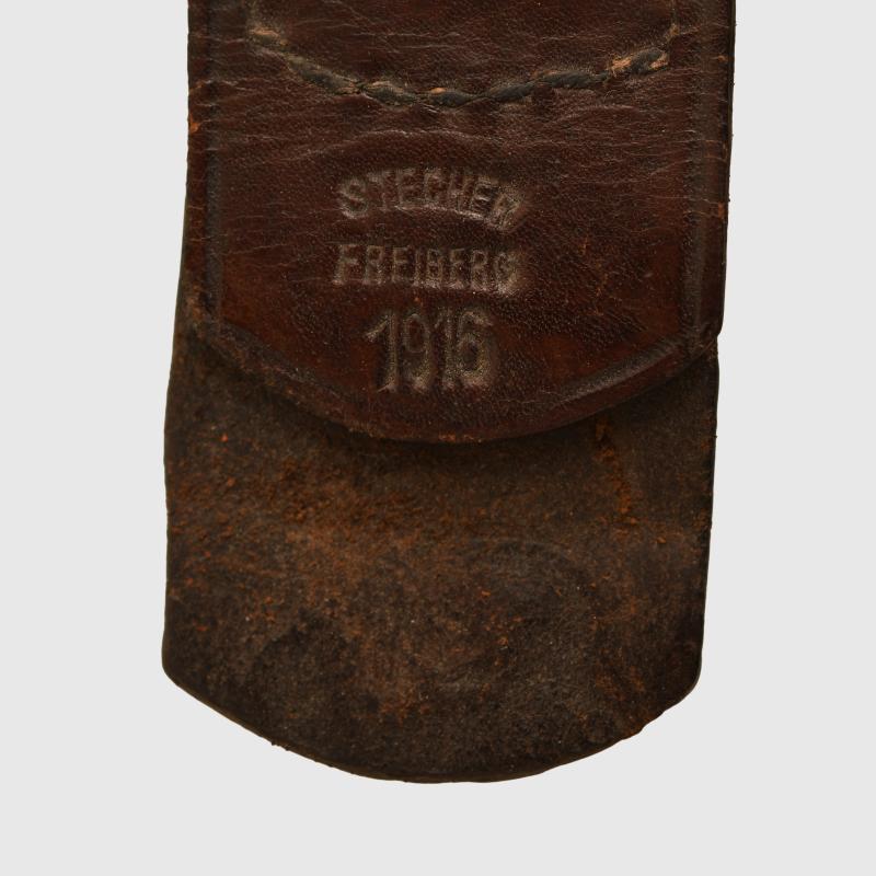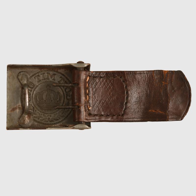 A very good all field grey one-piece enlisted mans steel belt buckle, complete with its leather tab, which is marked to the Prussian Guard Corps and dated ‘1915’, the markings of ‘B.A.G.’ indicating Guards Depot, plus maker mark and ‘1916’ date.