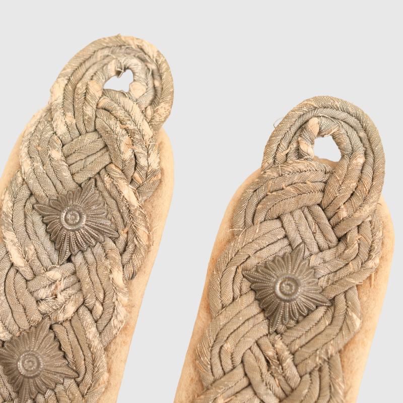 A pair of well used stitch-in infantry shoulder boards for an Army Oberst. Some loss of silvering to the twisted cord and storage staining to the white infantry underlay.