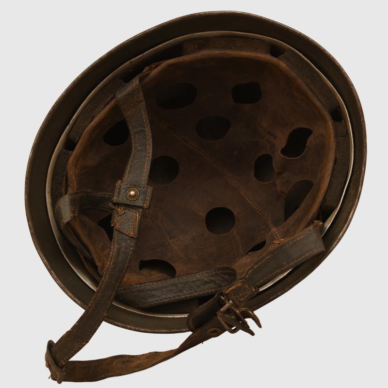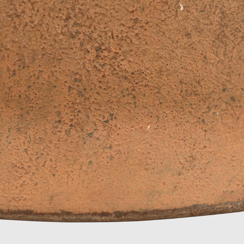 A very good E.T. 71 sized shell painted in a semi tropical finish, possibly used in either North Africa or Southern Italy, at least 70% of the original tropical paint finish remaining, with losses of the paint to the crown area, this is the early three hole spanner bolt model, the inner lining all complete with a single slight tear between one of the stamped holes, the shell size and liner size is faint but visible, also faint traces of the manufacturer, 1/3rd of the stitching that joins the two liner halves together appears to have been restored, with some of the stitching rotted, the inner rubber cushion is solid, the helmet is complete with its original set of chinstrap’s with the two sliding male adjusters present, and the single female stud complete and functioning correctly. More extensive, extra images can be seen on our new Premium website, type in regimentalsmilitaria.co.uk in to your web browser.