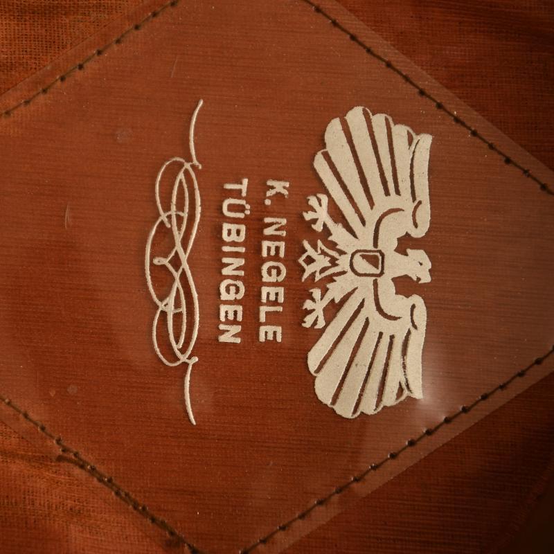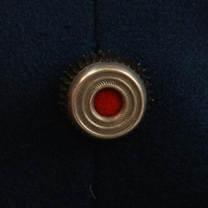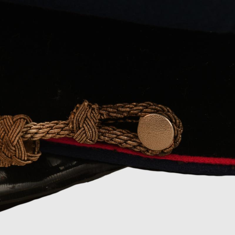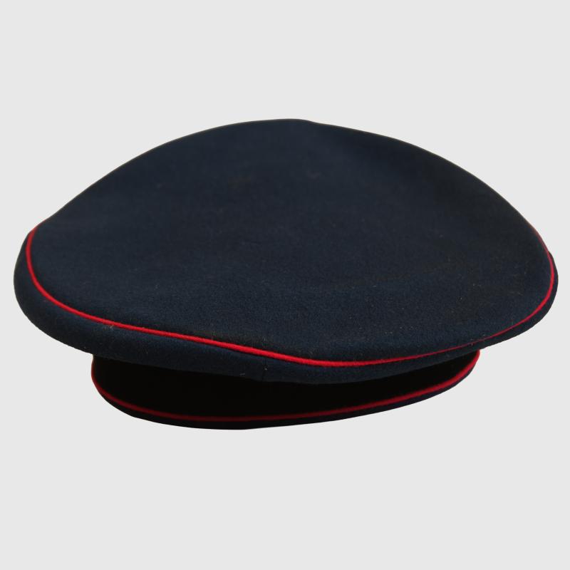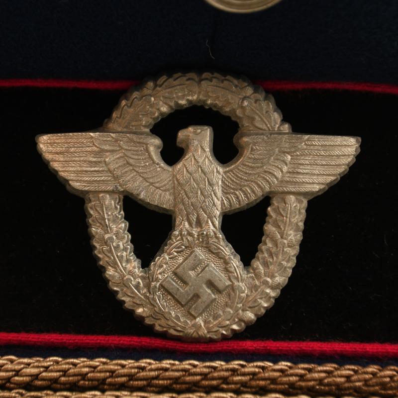 A good large size, possibly 58 or 59 Fire Police officers visor cap. Good body, no moth anywhere on the cap, red piping, black velvet centre band, officers central cockade with the police style officers badge in struck aluminium, officers cap cords, twin pebbled side buttons. To the interior the leather liner slightly split but virtually all complete with its waterproof upper inner crown lining in russet brown with a full celluloid centre lozenge with a retailer of ‘K.Negele of Tubingen’. More extensive, extra images can be seen on our new Premium website, type in regimentalsmilitaria.co.uk in to your web browser.