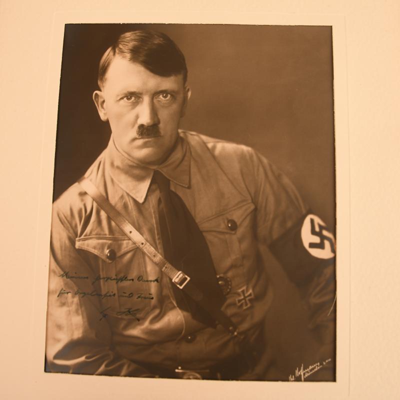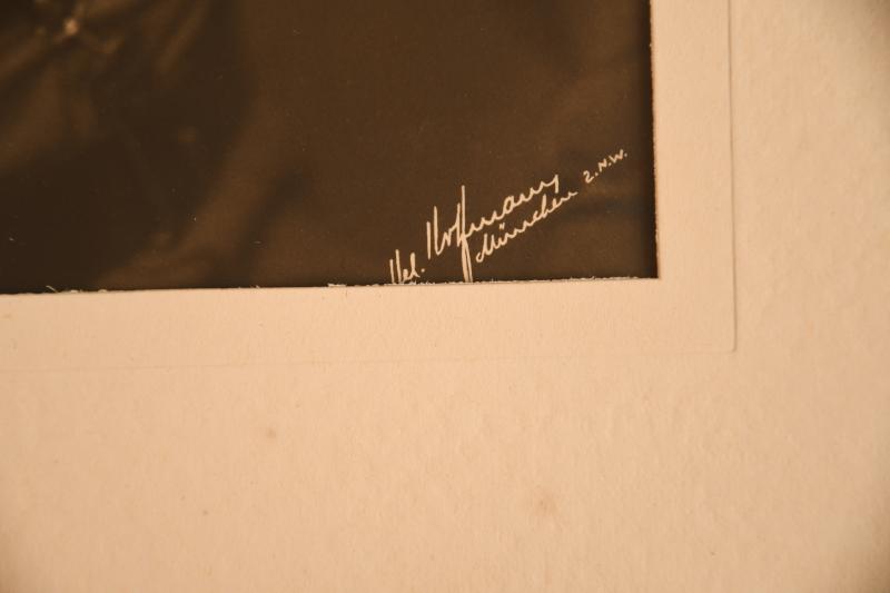 A very impressive large format photograph in the even larger formatted white board mount. The photograph measures 22cm x 28cm in a mount which measures 34cm x 36cm. The image shows Adolf Hitler wearing his brown shirt political uniform wearing WWI Wound Badge and WWI Iron Cross. To the left a two line inscription in his own hand with his pen signature below. A sheet of thin tracing type paper which presumably would be to protect the image but would presumably be removed when the image was mounted in a solid frame, which was never framed. On the reverse side there are small printed details which appear to be of the sizes of the mount. The recipient of this signed dedicated photograph never had it mounted.