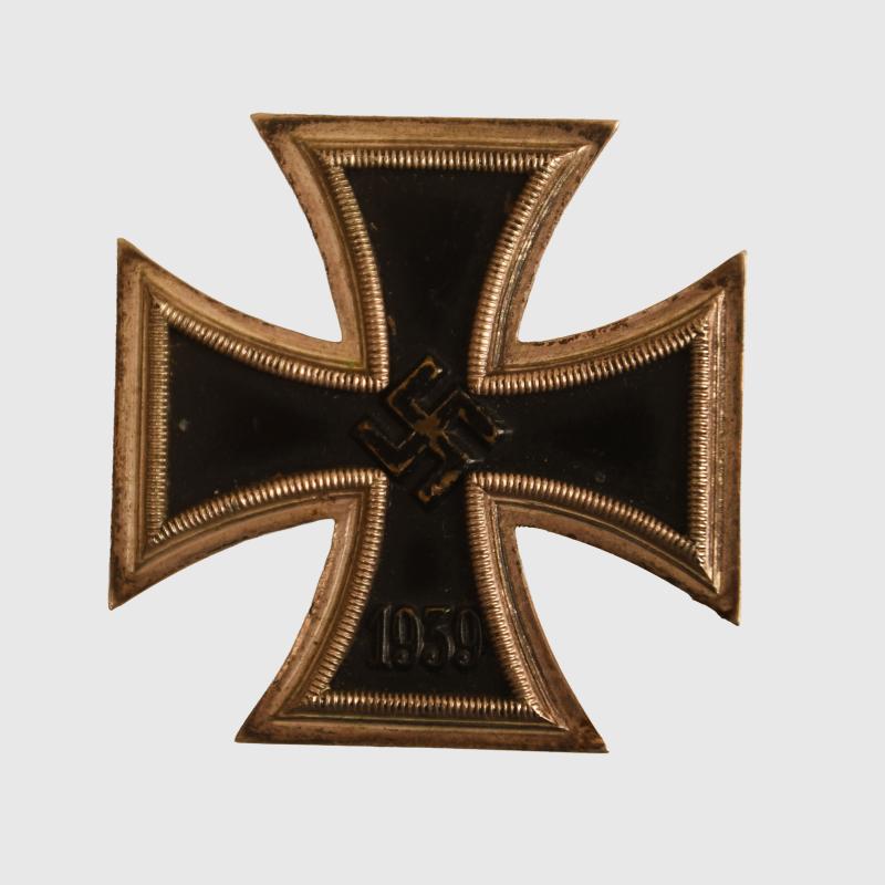 An excellent example of the Iron Cross 1st class, 1939 marked, swastika to the centre. All black finish to the centre good with slight rubbing to the swastika. At least 80% of the finish remaining to the frame with its wide tapering pin, original hook and hinge in its slightly domed presentation case with the silver outline of the Iron Cross to the exterior. The flock base has darkened, the underneath of the Iron Cross is a lighter shade with an impression to the upper inner silk lid of the Iron Cross itself. Closing catch working correctly.