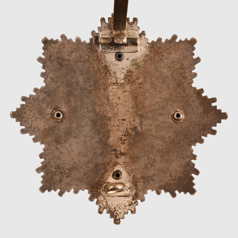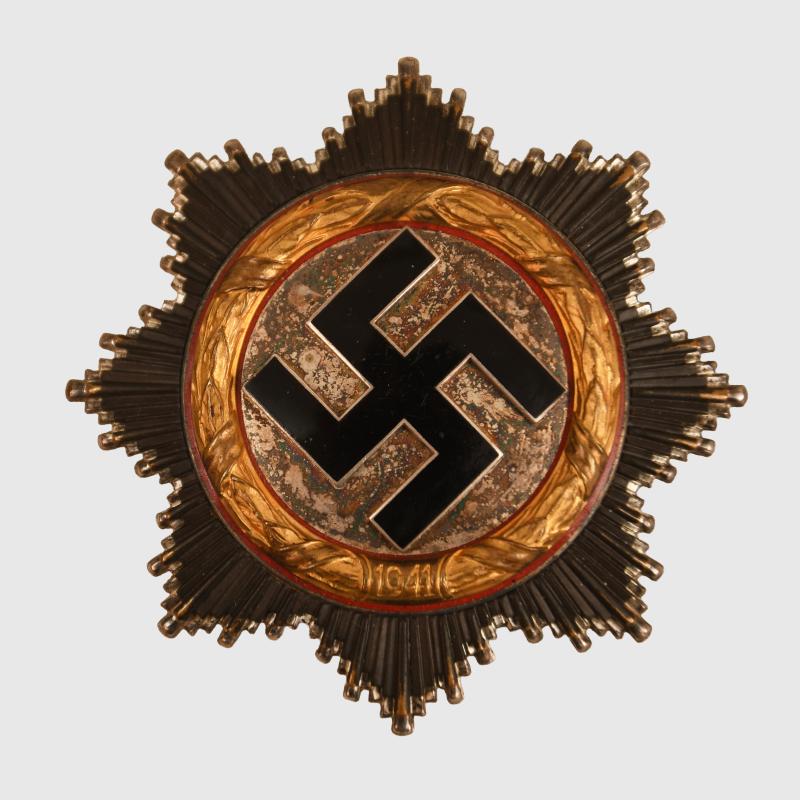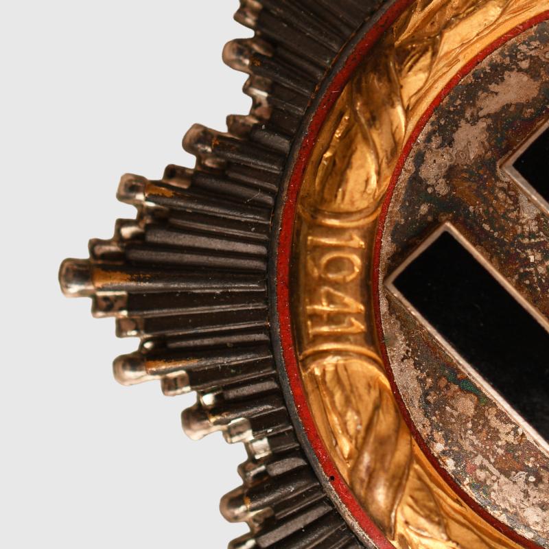 A very nice example of a number ‘20’ marked Zimmermann & Company produced German Cross in gold, classic construction, four domed hollow rivets, wide tapering pin, original hook and hinge. Good gilt remaining to the 1941 dated wreath. Excellent enamels. All of the black finish remaining to the ray and virtually all the silver finish to the star behind the ray. All of the red enamel to the disc underneath the ‘41’ dated wreath intact. Fitted in its original gold lined box, some slight scuffing to the edges of the box and an imprint to the upper inner lid of the wreath of the award. More extensive, extra images can be seen on our new Premium website, type in regimentalsmilitaria.co.uk in to your web browser.