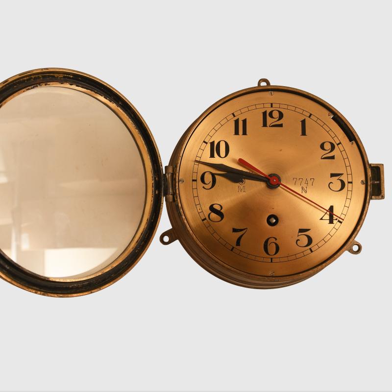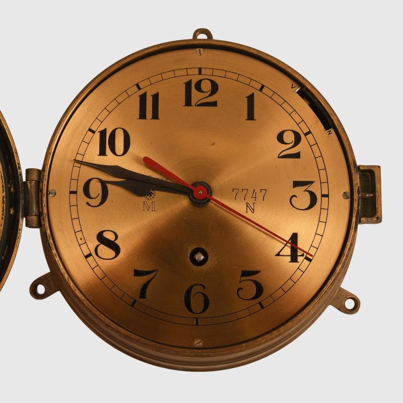 A nice condition bulkhead clock, the exterior brass body appears never to have been cleaned, the silvered finish to the dial has been polished away, the eagle and swastika over ‘M’ is clear but faint with the number ‘7747’ over ‘N’ to the right hand side of the dial. On the reverse side the clock is stamped ‘4363’ the numbers ‘63’ alone are stamped close to the closure face lock, also on the opposite side on the face hinge. The clock is fully functional and keeping excellent time, it is also complete with its three wall fixing lugs.