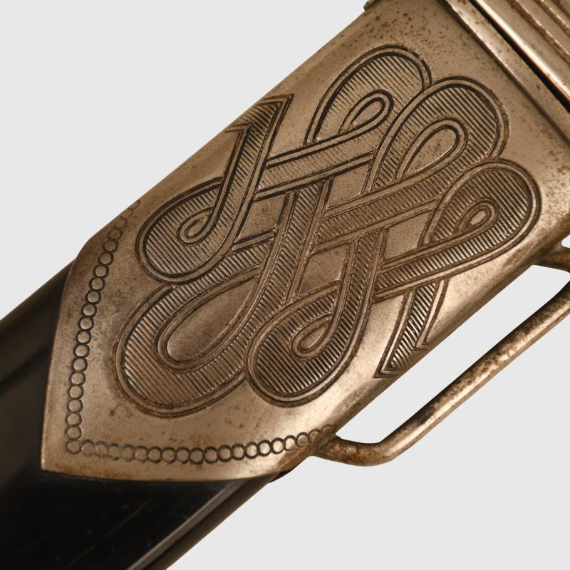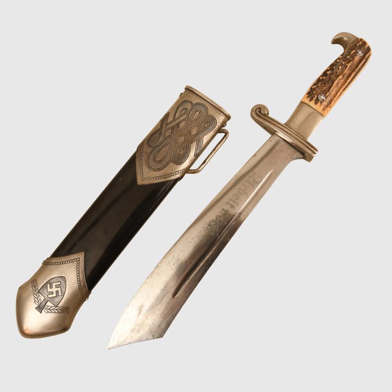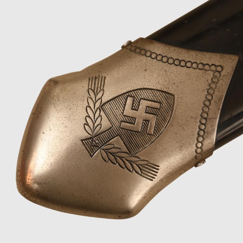 It has always been traditionally difficult to obtain any of the RAD hewers in nice clean condition, this example with a blade by Alcoso having slight scratch marks to the blade but no abusing or reprofiling. Good deep motto of ‘Arbeit Adelt’. The heavy nickel finish to the whole hilt is very good and bright. Undamaged stag grips. Fitted into its correct scabbard, very minor spotting to the plating on the face side of the upper scabbard mount, lower scabbard mount perfect. The centre of the scabbard retains virtually all of its paint finish with slight spidering showing through from the steel below with some minor chips to the edge and on the reverse side. All screws are the correct type and are all intact. A very fine example. The sale of Knives, other Edged Weapons and Firearms are restricted to those aged over 18. Verification of age is required before purchase is concluded, this will include providing a scan of photo ID including your address and in some cases may require video verification by FaceTime or WhatsApp video, at Regimentals discretion, until formal laws on this requirement are enforced in the UK. More extensive, extra images can be seen on our new Premium website, type in regimentalsmilitaria.co.uk in to your web browser.