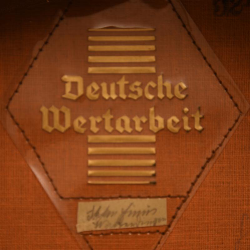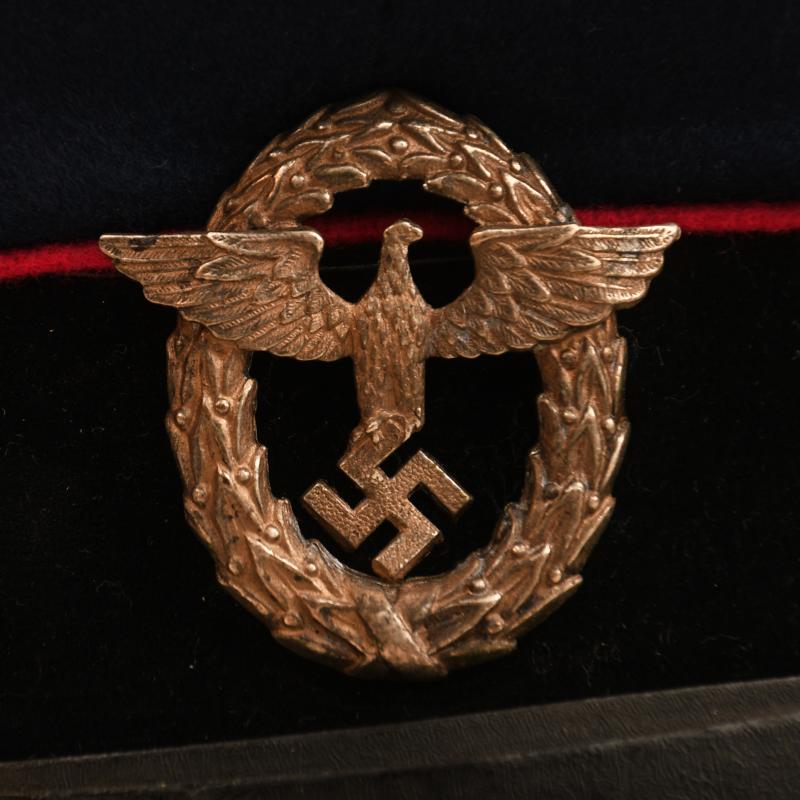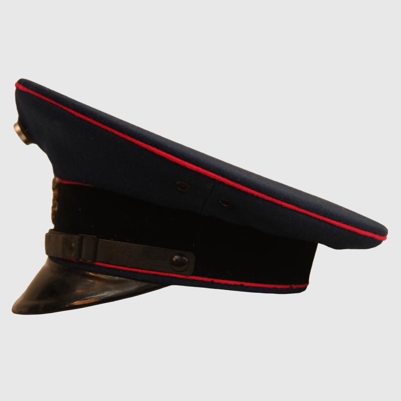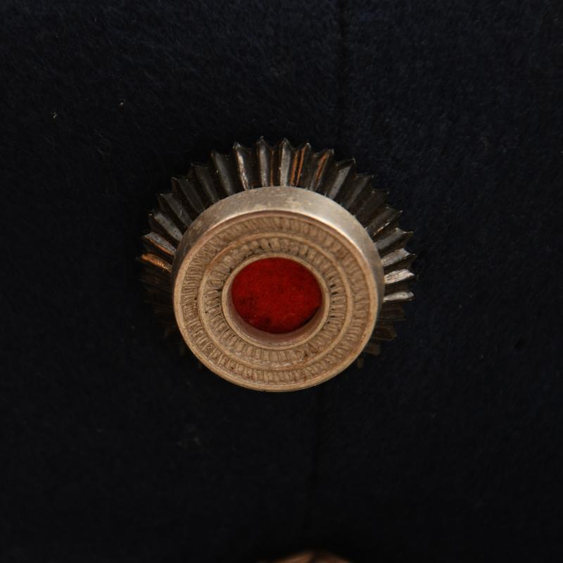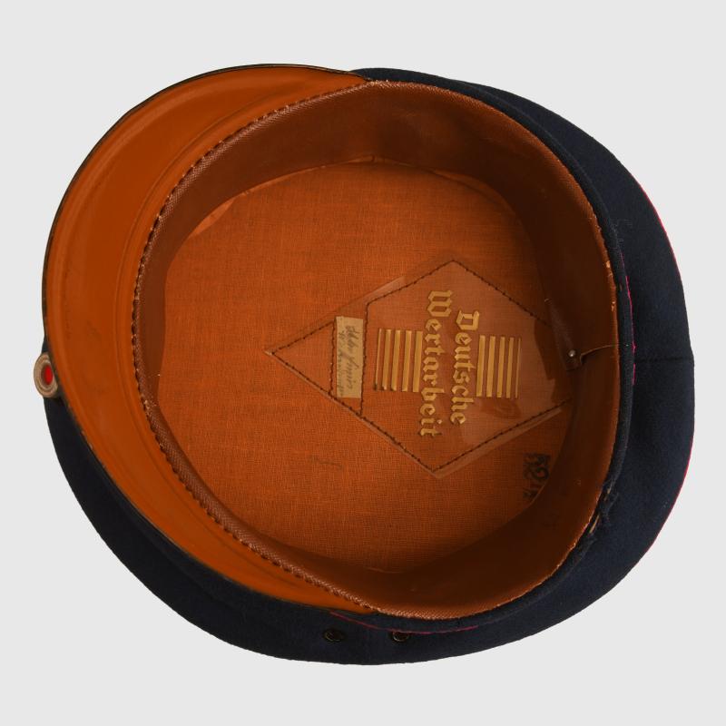 A very nice example , high saddle shape, stamped size ’52 ½’. Good blue body, red piping to the crown and to the upper and lower parts of the black velvet centre band, national cockade. Fire Police nice quality cap badge with original leather strap and black side buttons. To the interior the sweatband is present, the full and complete celluloid lozenge gold blocked ‘Deutsche Wert Arbeit’ with an original owner’s name to a slip of paper below the gold blocking. Slight damage to the red waffenfarbe at the lower part of the black velvet band on the reverse side.
