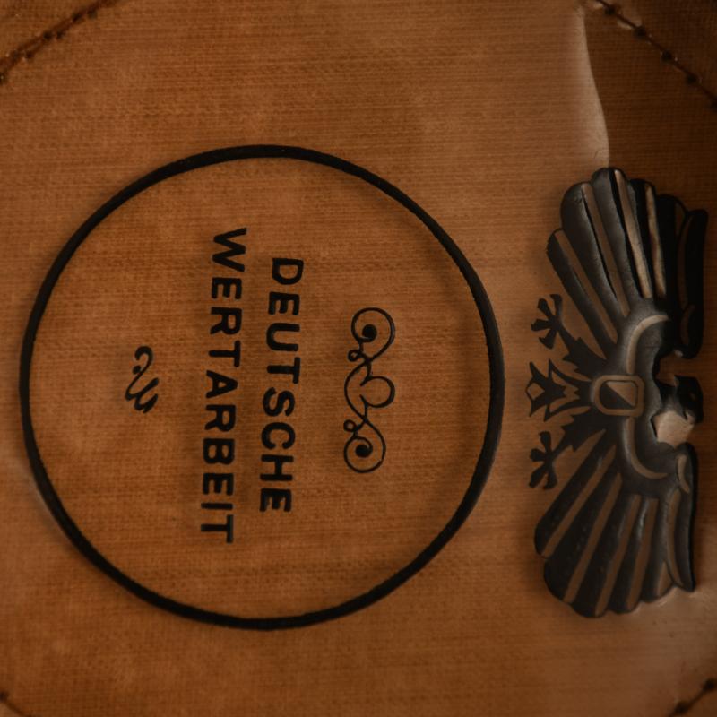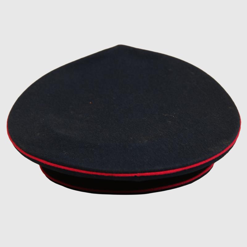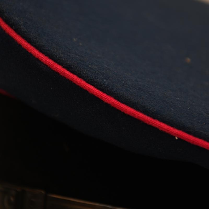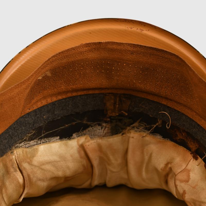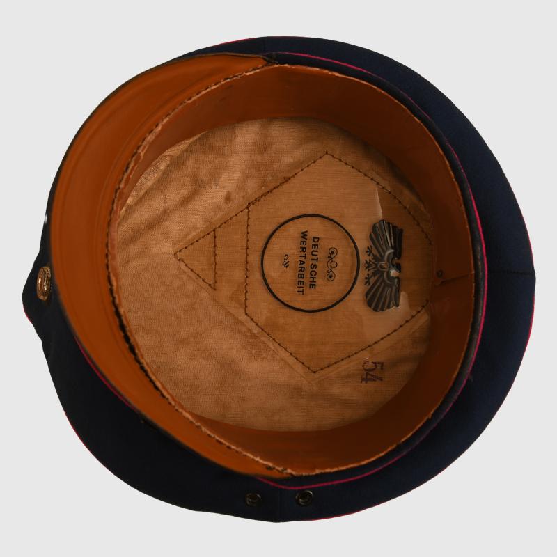 Good blue body, no moth anywhere on the cap, red piping, black velvet centre band, officers style cockade with police style struck aluminium front badge, standard enlisted mans leather strap, fibre peak. The lining is of the ersatz style, stitches slightly loose to the interior of the forehead area. Stamped size ‘54’ to the inner crown lining with a complete celluloid centred lozenge with the logo ‘DEUTSCHE WERT ARBEIT’.
