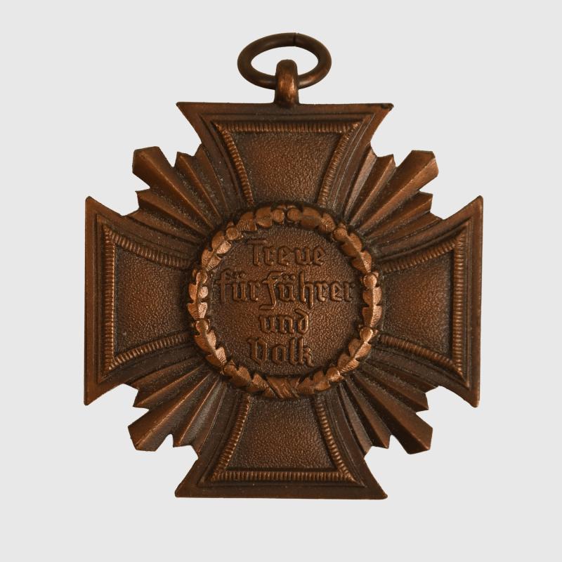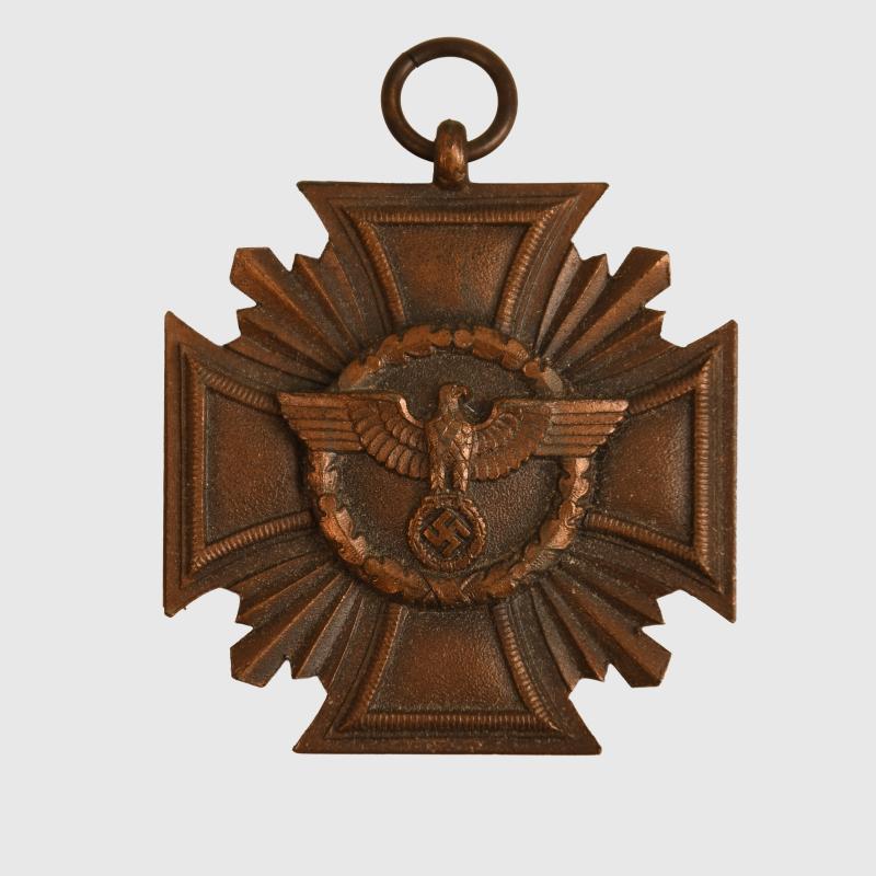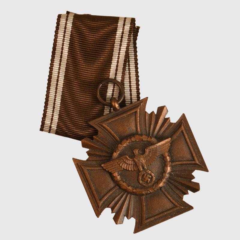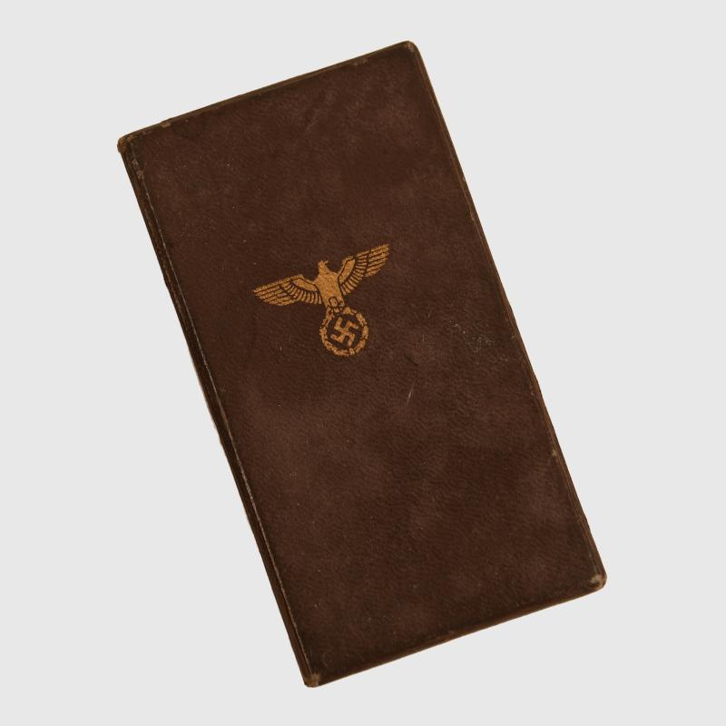 The award having all of its original bronze finish remaining with its separate section of ribbon, all laid into its brown presentation case with the gilded Third Reich political eagle to the exterior lid.