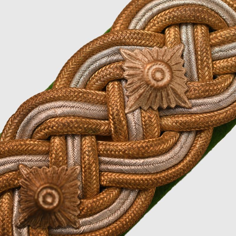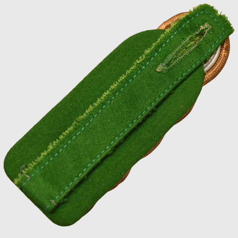 A single shoulder strap, silver and gold bullion on green base material. Two silver pips. The green under strap for slip-on use. A rare shoulder strap.