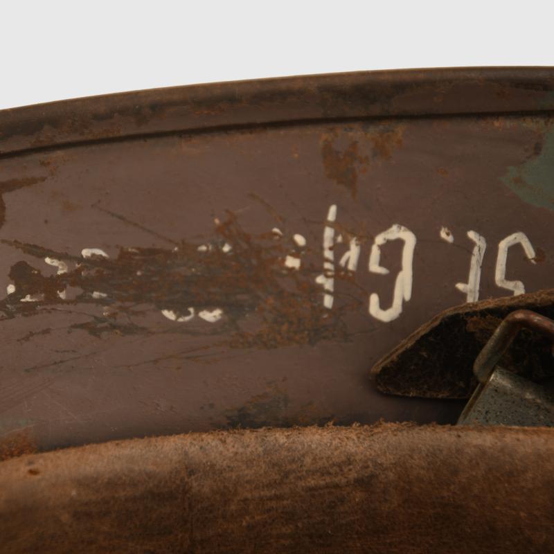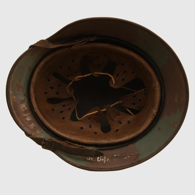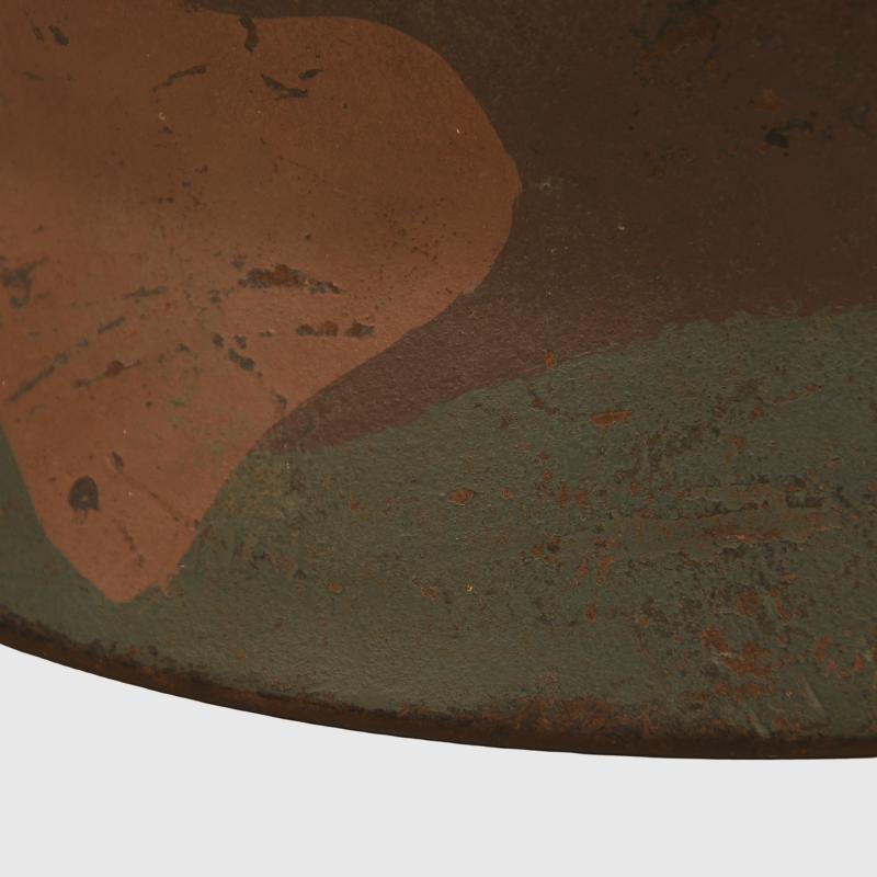 A very scarce and totally original M.40 combat helmet, stamped size Q66. The exterior of the helmet is in a three toned camouflage of green, tan and brown, similar in style to a first war camouflage finish but without separation lines. The original Luftwaffe decal is nice and clear, one small section of the tan has run over the forward wing of the eagle, the camouflage painting has been done very carefully around the eagle, there is a slight run of the green over the bottom leg of the swastika. Some loss to the paint has can be seen in our web images. A name partially obliterated from the inside of the skirt, probably indicating that it was passed from one wearer to another. The interior lining is all complete with its 8 tongues and its original drawstring and its original chinstrap. It would appear to us that the liner was taken out of the helmet for the camouflage painting and then replaced as the camouflage is also on the inside of the helmet below the line of the edge of the zinc liner band. The three liner retaining rivets head have no paint finish on them at all. This was more than likely used by a member of the Luftwaffe Field Division. More extensive, extra images can be seen on our new Premium website, type in regimentalsmilitaria.co.uk in to your web browser.