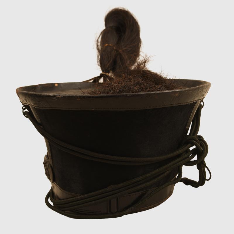 A rare and exceptional condition bell top shako from the reign of William IV, the leather top and peak superb stitching has not rotted, leather has not been pierced or distorted, the Beaver sides again excellent without any moth damage, the helmet does not have a regimental distinction but is possibly a Yeomanry regiment or a Rifle regiment with all the fittings being in black, it’s lions head motifs also in black on either side of the helmet to allow the suspension of the green corded cap lines, one of the individual plates for the chin scales are missing on one side, the horsehair plume in black complete, to the interior the helmet is in a magnificent condition, the red leather sweatband is intact with the remainder of the interior completely lined in red silk which has some slight staining and age foxing but has not shot. More extensive, extra images can be seen on our new Premium website, type in regimentalsmilitaria.co.uk in to your web browser.