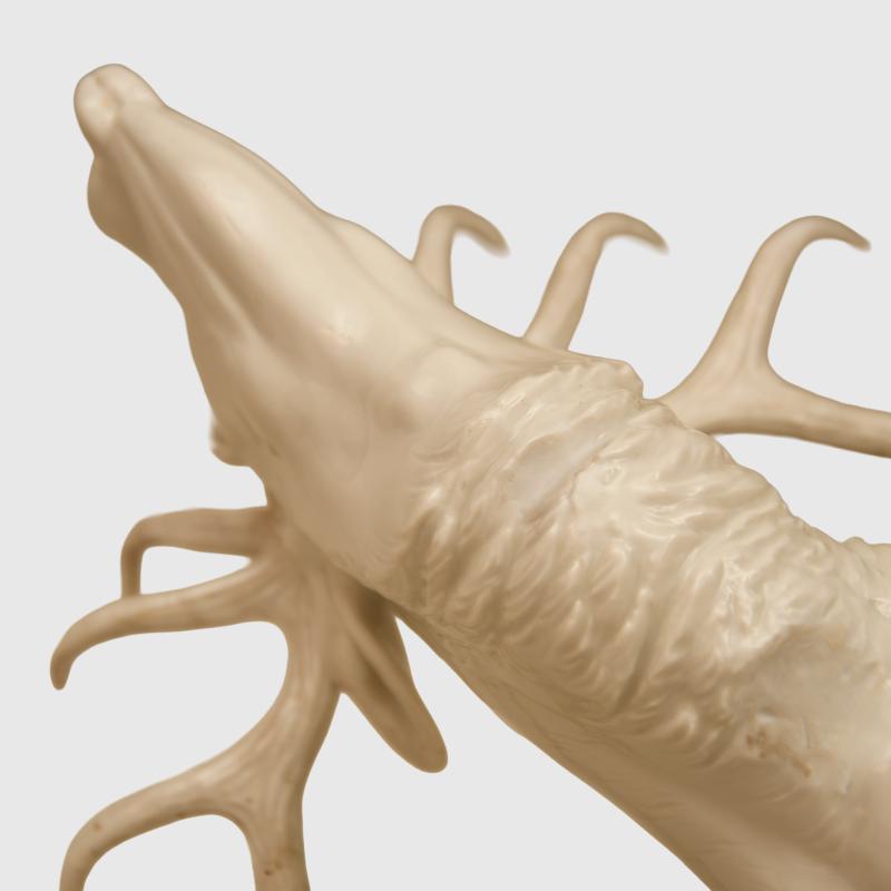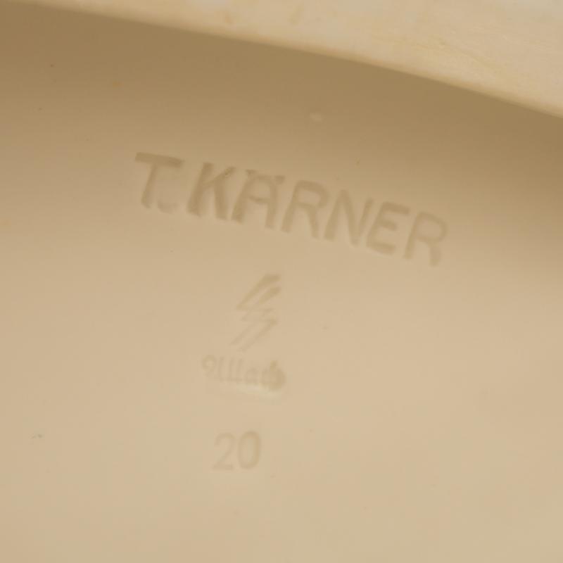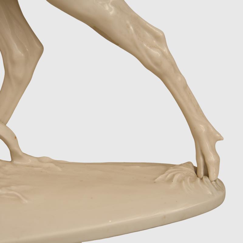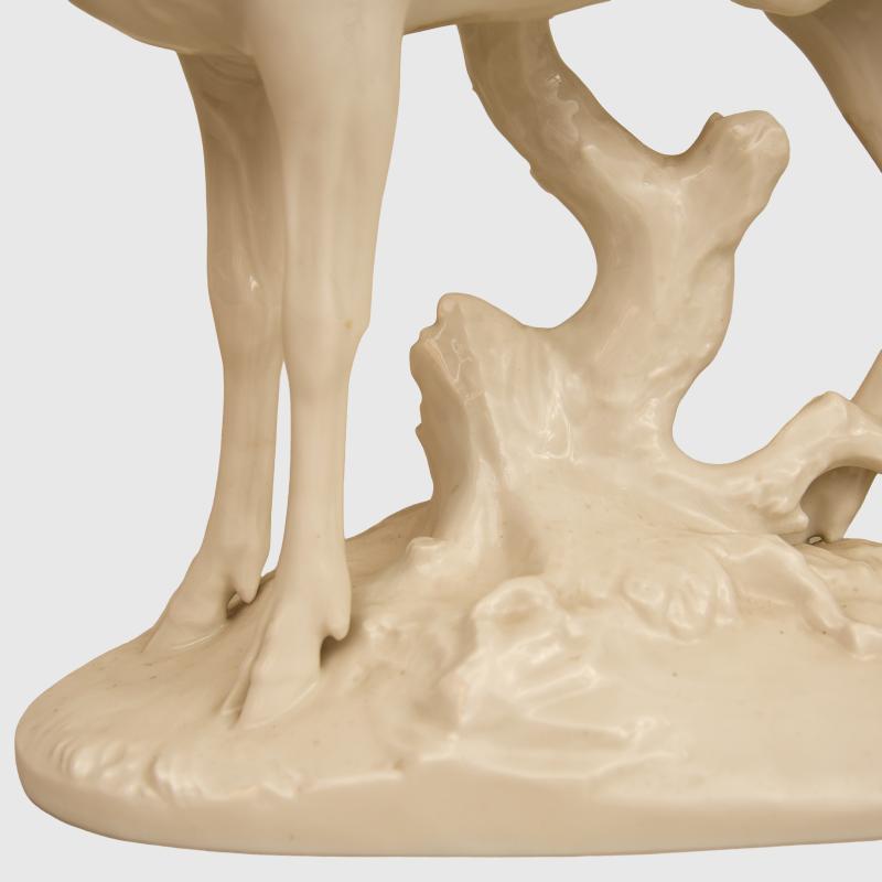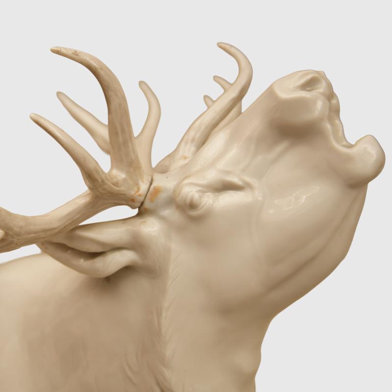 A fabulous example of one of the larger pieces of Allach porcelain produced by the SS on the edges of the concentration camp of Dachau, being the rare white glazed porcelain Rohrender The Roaring Stag model number 20, Designed by the renowned porcelain artist Theodor Karner , according to the excellent Allach Porcelain work by Dennis R Porell only 76 figures were produced in total in white between the years 1938/ 39, 36.2 cm in height, the length from the mouth of the stags rear leg 40 cm, excellent photographs of the stag is shown on page 392 of the aforementioned work, marked T Karner with the SS runic press symbol on the base and the number 20, the piece is totally undamaged and unrepaired, a tip for collectors who want to ascertain if a piece of porcelain has been damage and repaired, is to place the lips against a definite unrepaired section of the item and it should be cold and then placed the lips of the possibly repaired section the temperature should be the same if unrepaired. Although we have over the last 50 years sent out many delicate items by shipping methods and have had a very low degree of accidents, we would not wish to pack and ship this ourselves, the antlers themselves are just too delicate, any prospective purchasers from within the UK should think about collection from our premises, any prospective purchasers from mainland Europe, can arrange with us to bring the item to anyone of the European fairs that we attend, prospective purchasers from outside the UK and Europe would have to pay for a professional porcelain shipping company to have the item delivered, which of course we would arrange. More extensive, extra images can be seen on our new Premium website, type in regimentalsmilitaria.co.uk in to your web browser.